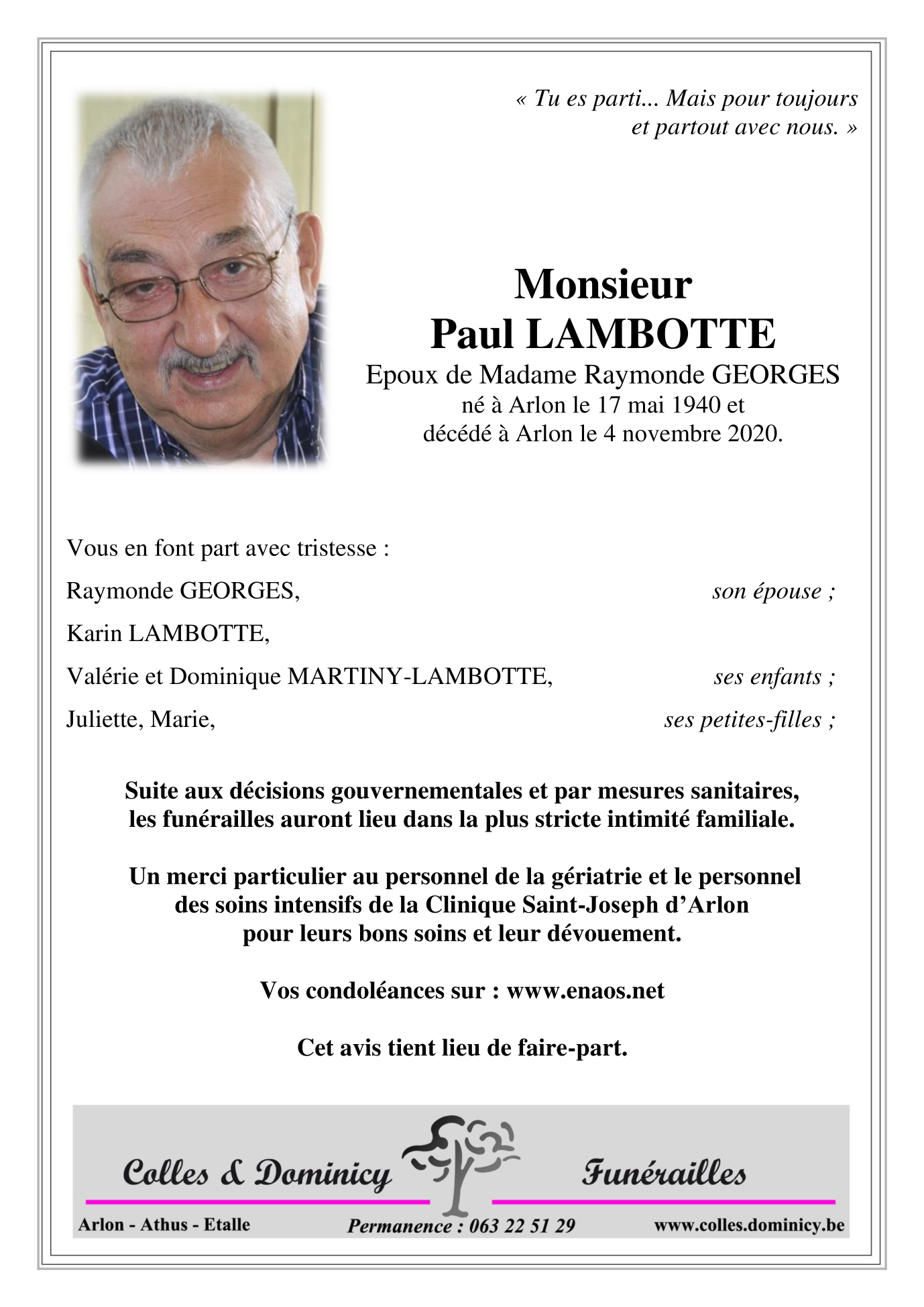 Décédé à Arlon (6700) le mercredi 4 novembre 2020 à l'âge de 80 ans
