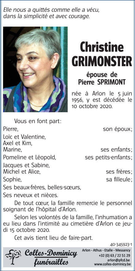 Décédée à Arlon (6700) le samedi 10 octobre 2020 à l'âge de 64 ans