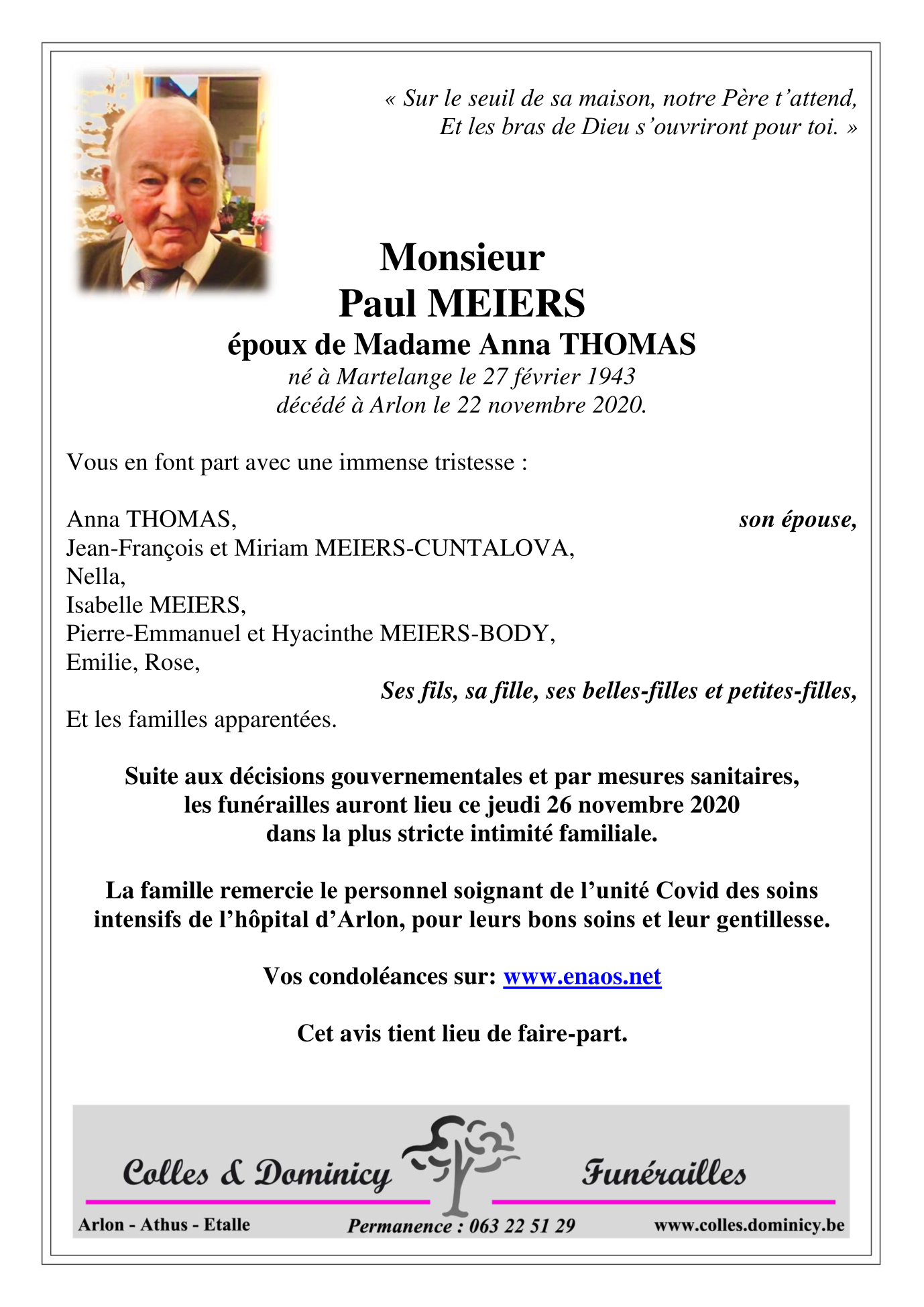 Décédé à Arlon (6700) le dimanche 22 novembre 2020 à l'âge de 77 ans