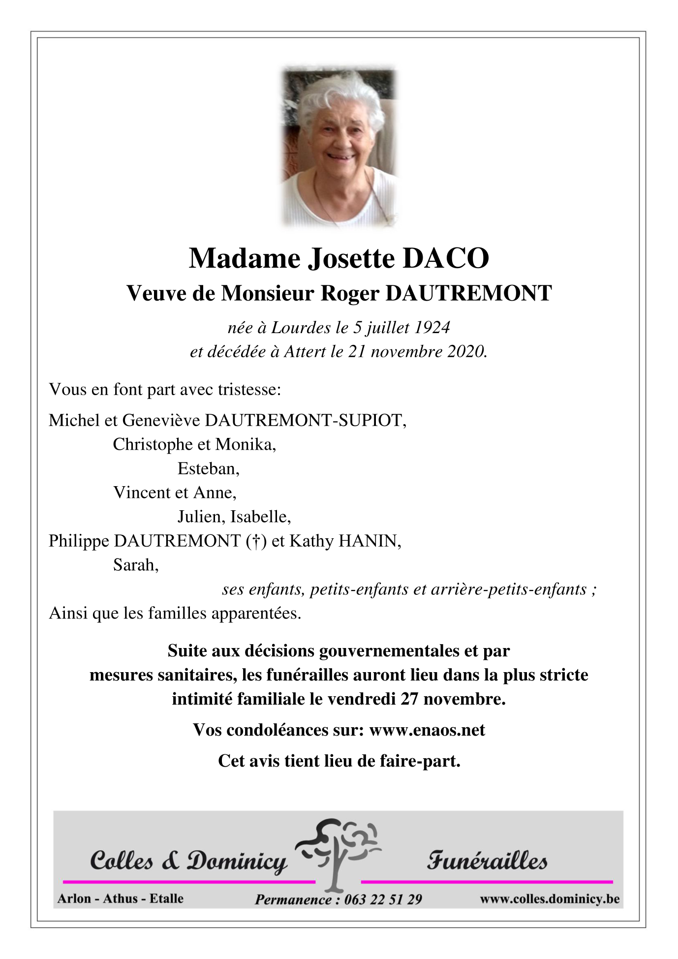 Décédée à Attert (6717) le samedi 21 novembre 2020 à l'âge de 96 ans