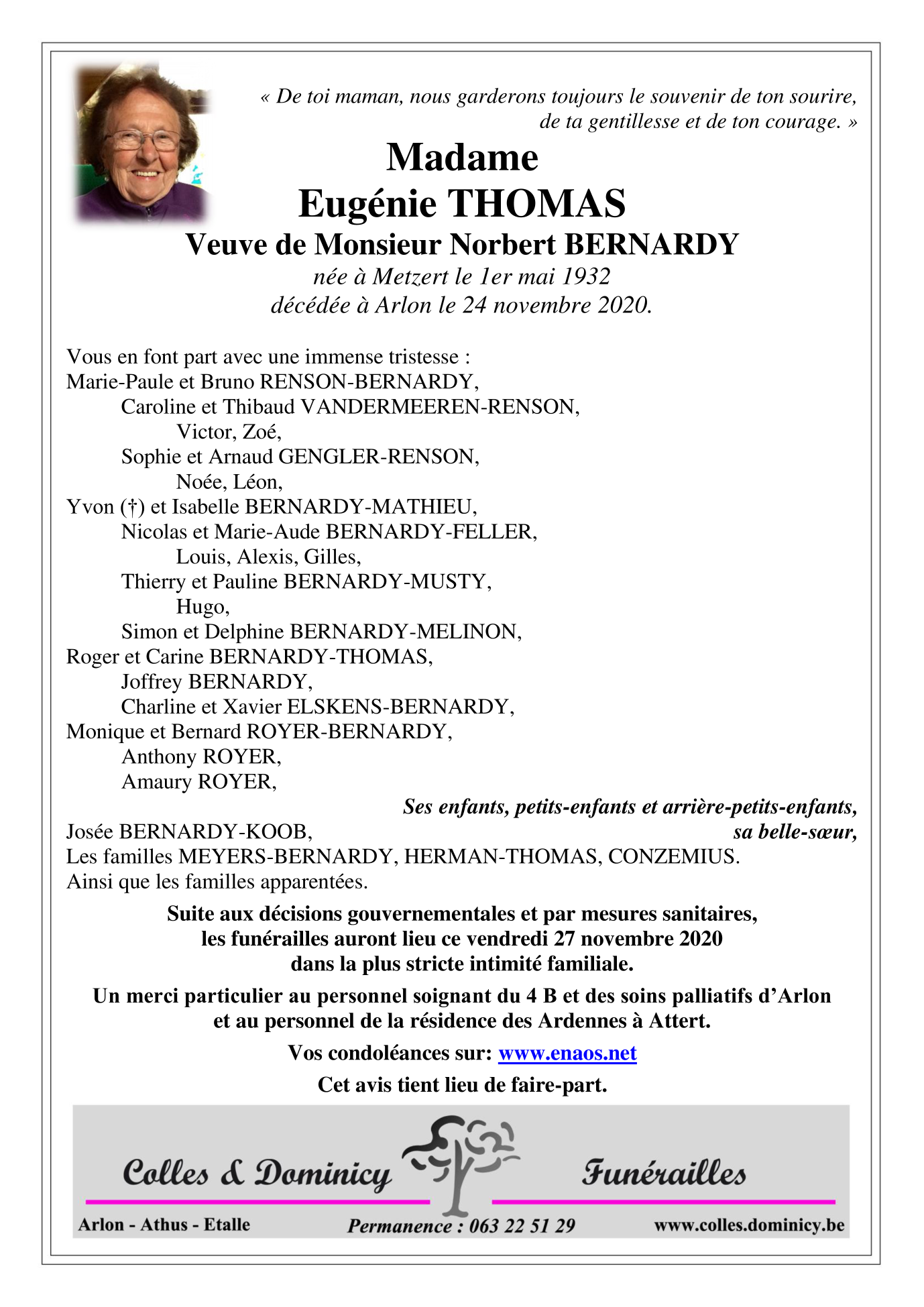 Décédée à Arlon (6700) le mardi 24 novembre 2020 à l'âge de 88 ans