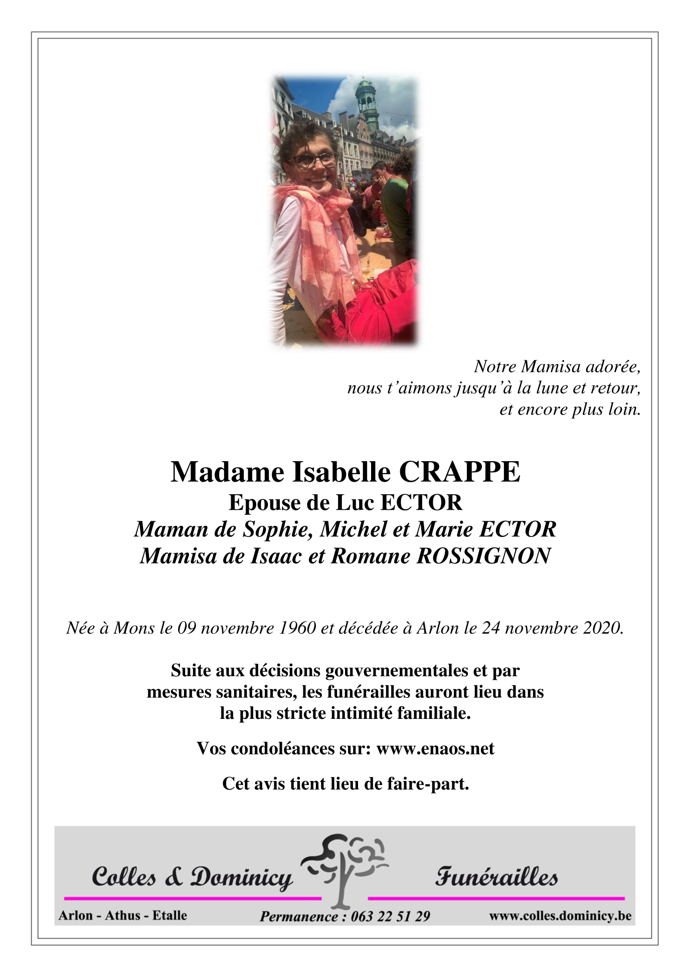Décédée à Arlon (6700) le mardi 24 novembre 2020 à l'âge de 60 ans