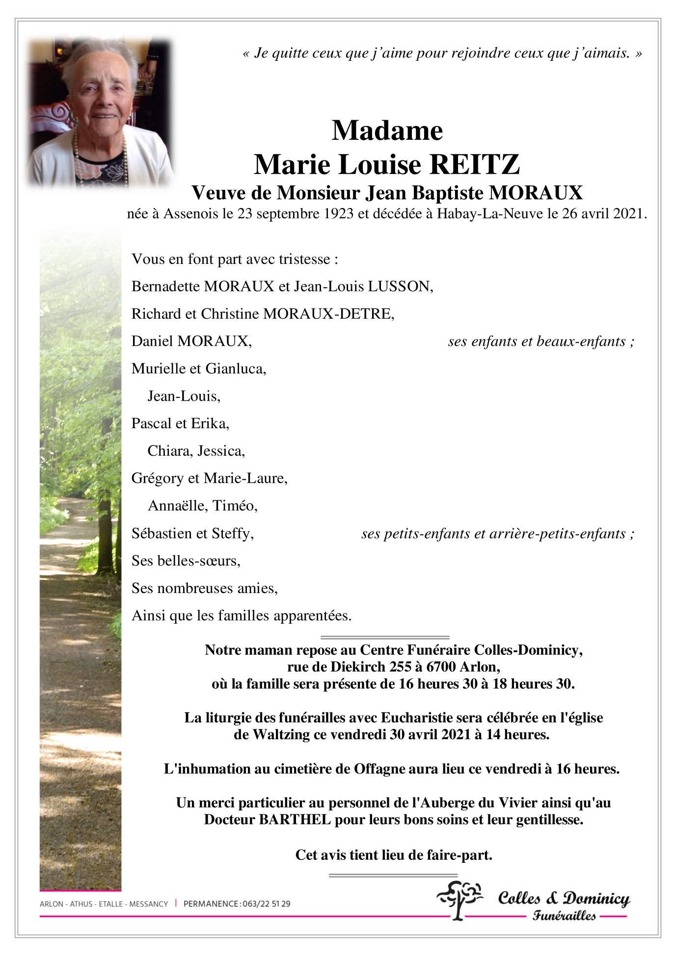 Décédée à Habay (6720) le lundi 26 avril 2021 à l'âge de 97 ans