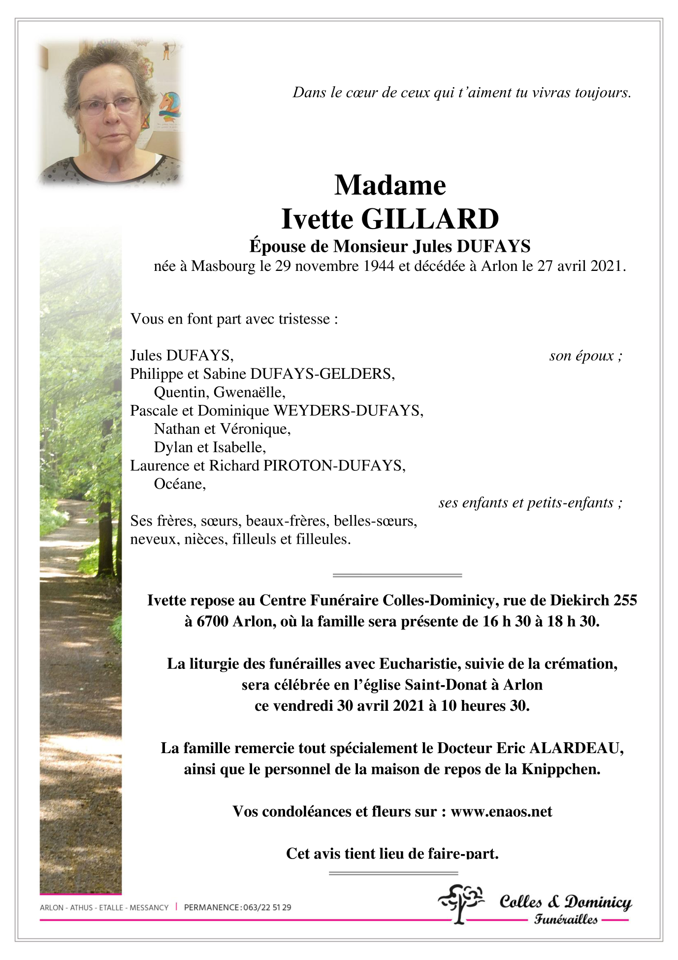 Décédée à Arlon (6700) le mardi 27 avril 2021 à l'âge de 76 ans