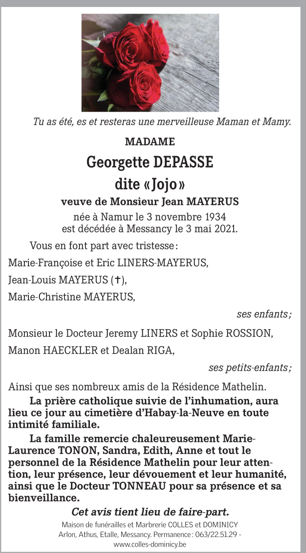 Décédée à Messancy (6780) le lundi 3 mai 2021 à l'âge de 86 ans