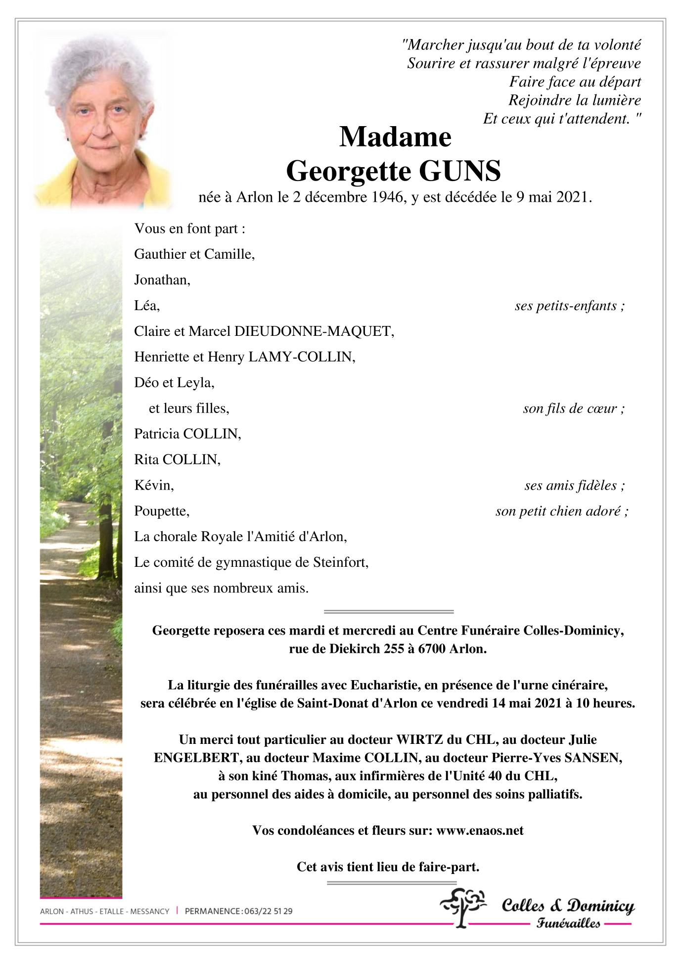 Décédée à Arlon (6700) le dimanche 9 mai 2021 à l'âge de 74 ans