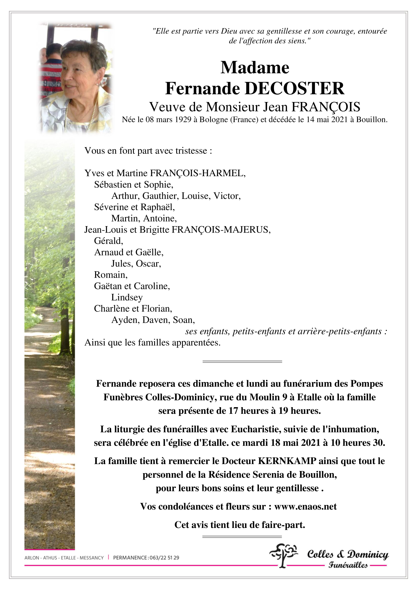 Décédée à Bouillon (6830) le vendredi 14 mai 2021 à l'âge de 92 ans