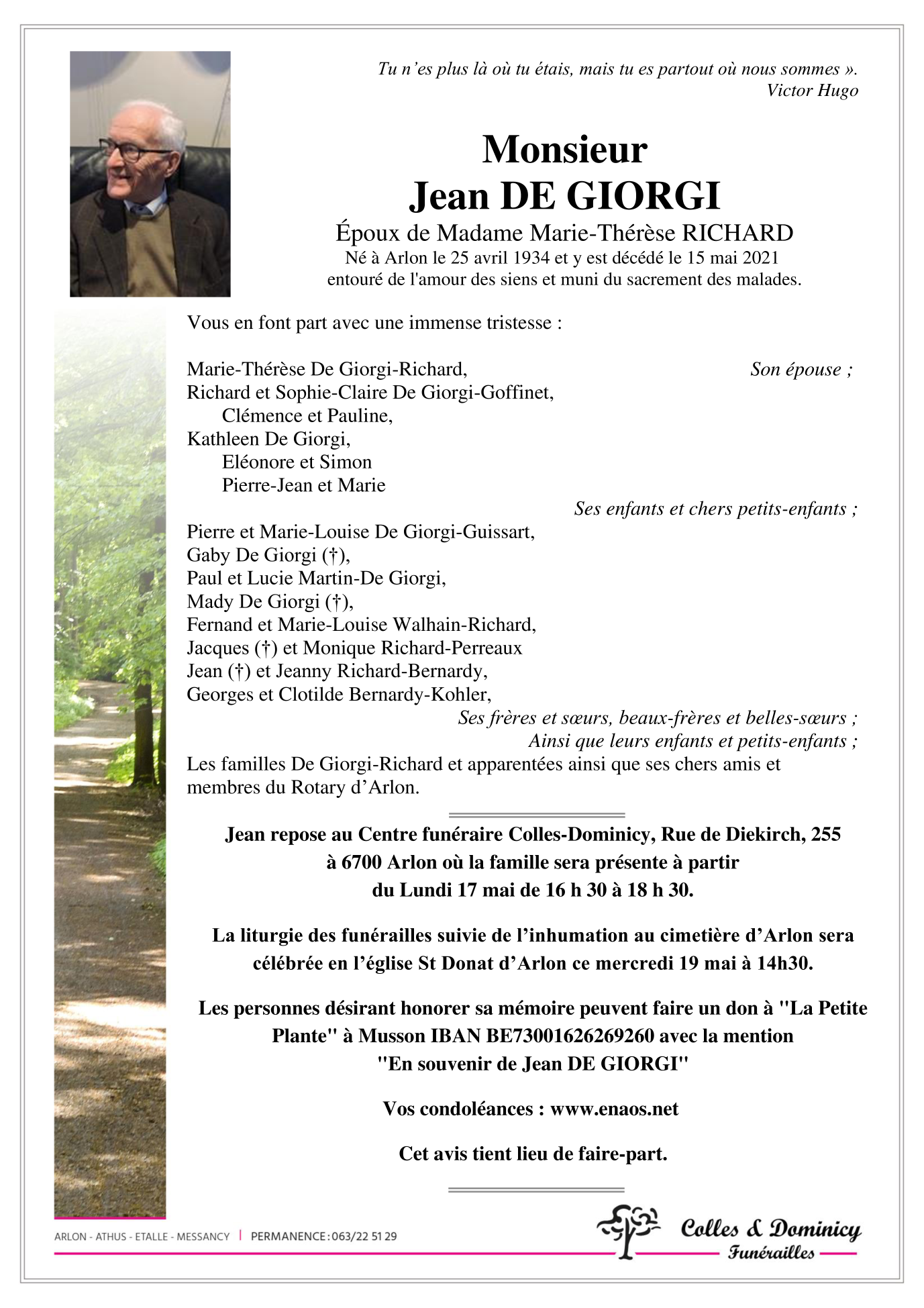 Décédé à Arlon (6700) le samedi 15 mai 2021 à l'âge de 87 ans