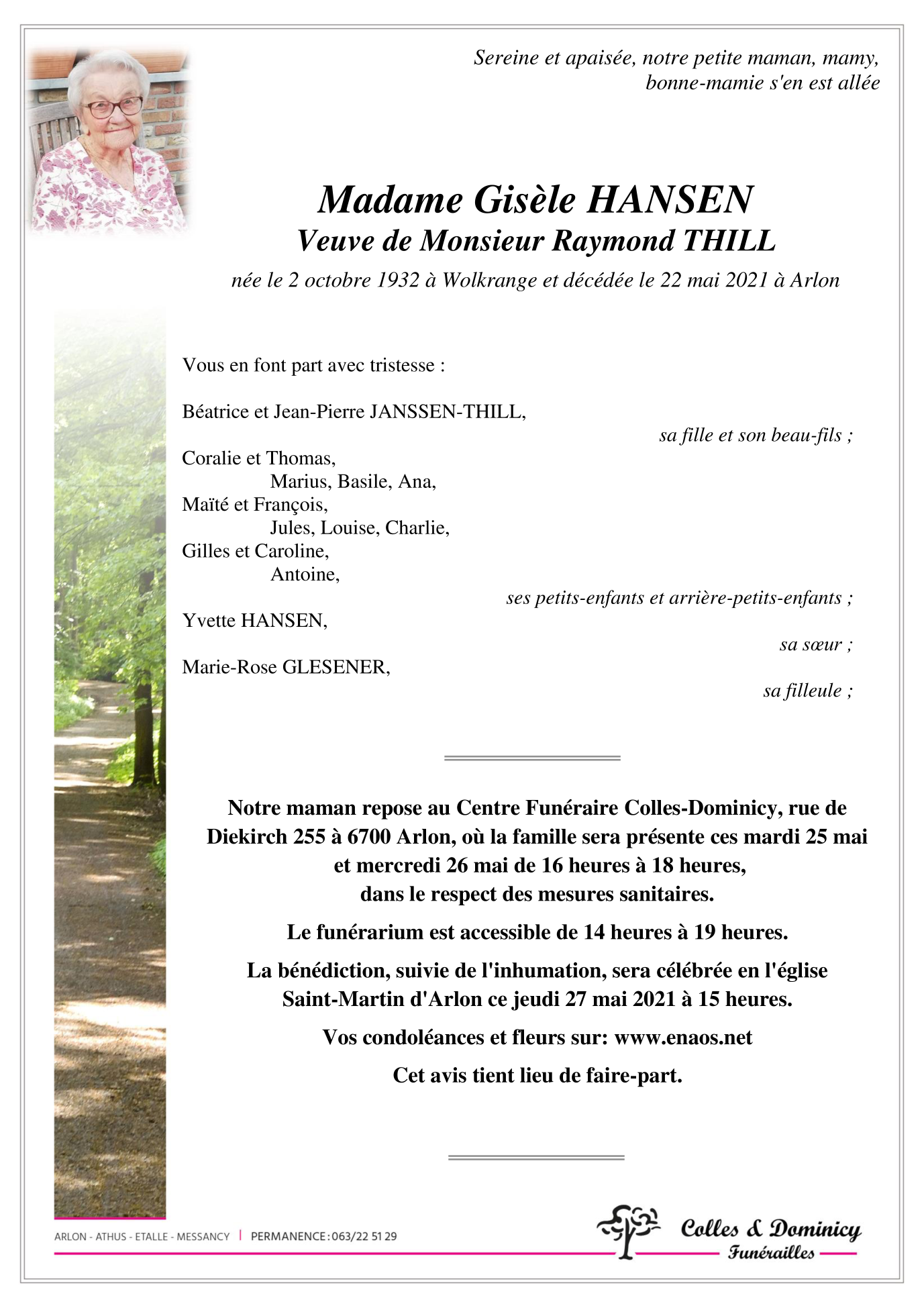 Décédée à Arlon (6700) le samedi 22 mai 2021 à l'âge de 88 ans