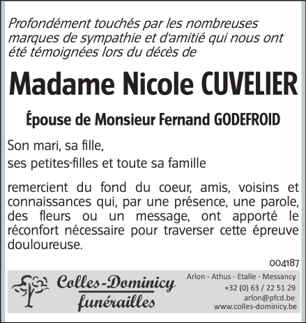 Décédée à Arlon (6700) le mercredi 5 mai 2021 à l'âge de 79 ans