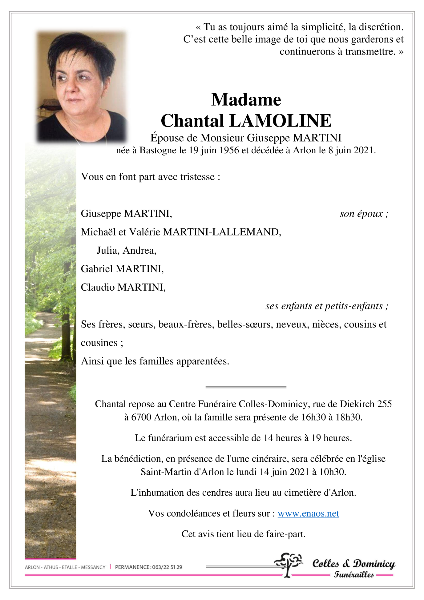 Décédée à Arlon (6700) le mardi 8 juin 2021 à l'âge de 64 ans