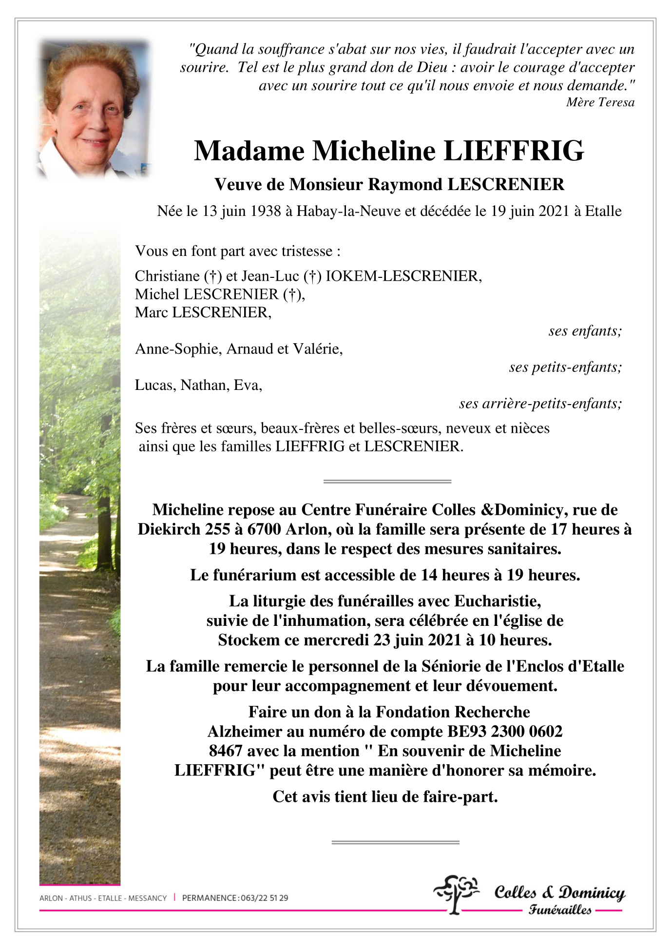 Née à Habay-la-Neuve (6720) le lundi 13 juin 1938