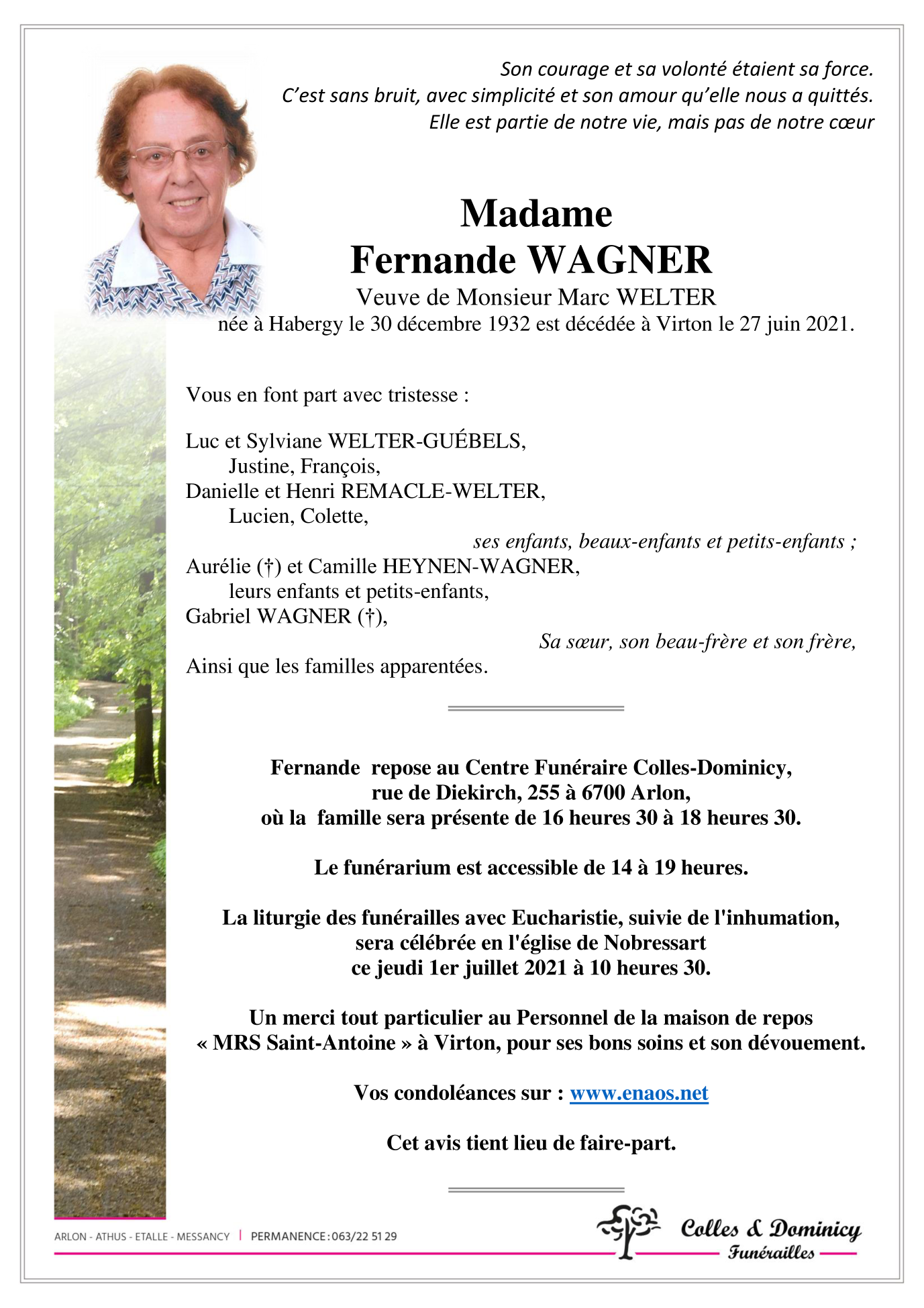 Décédée à Saint-Mard (6762) le dimanche 27 juin 2021 à l'âge de 88 ans