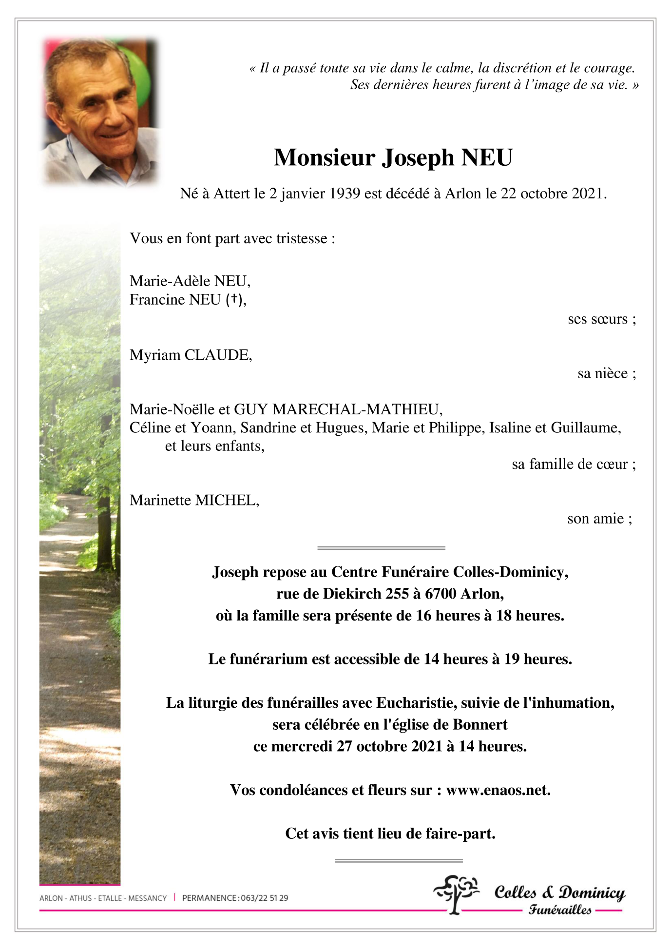 Décédé à Arlon (6700) le vendredi 22 octobre 2021 à l'âge de 82 ans