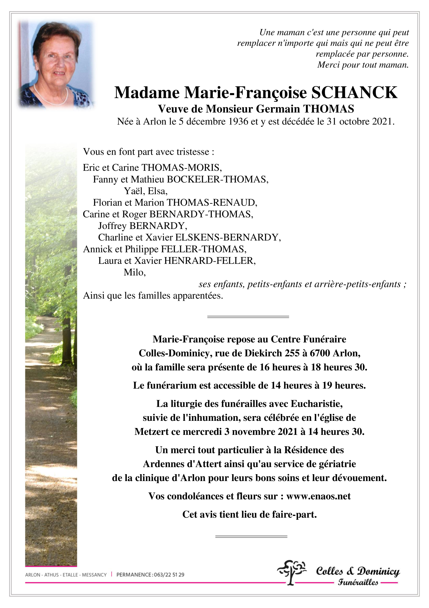 Décédée à Arlon (6700) le dimanche 31 octobre 2021 à l'âge de 84 ans