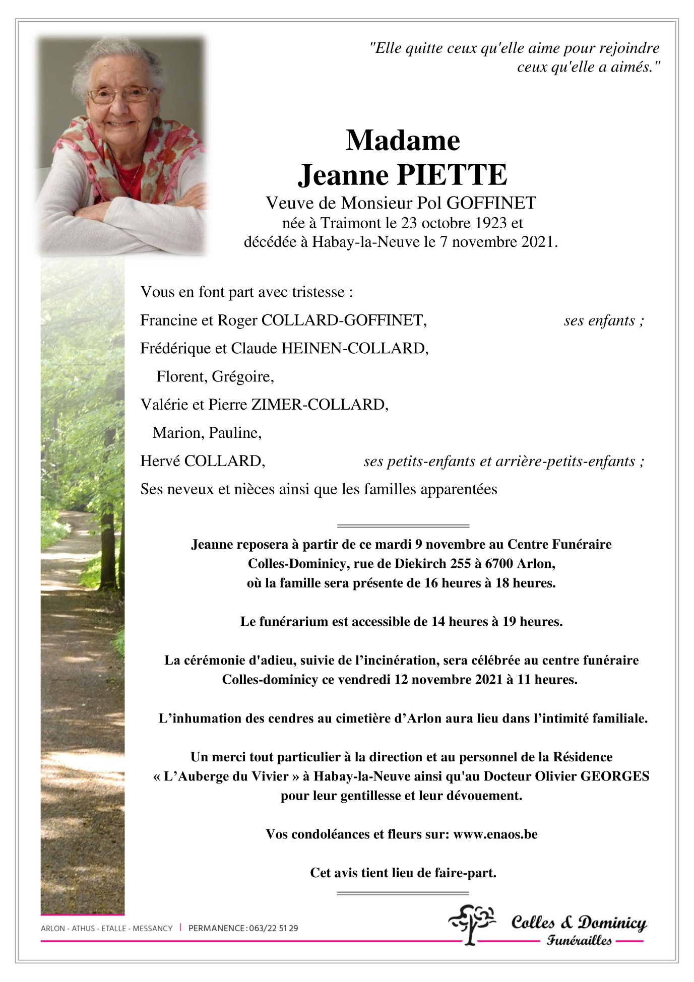 Décédée à Habay (6720) le dimanche 7 novembre 2021 à l'âge de 98 ans