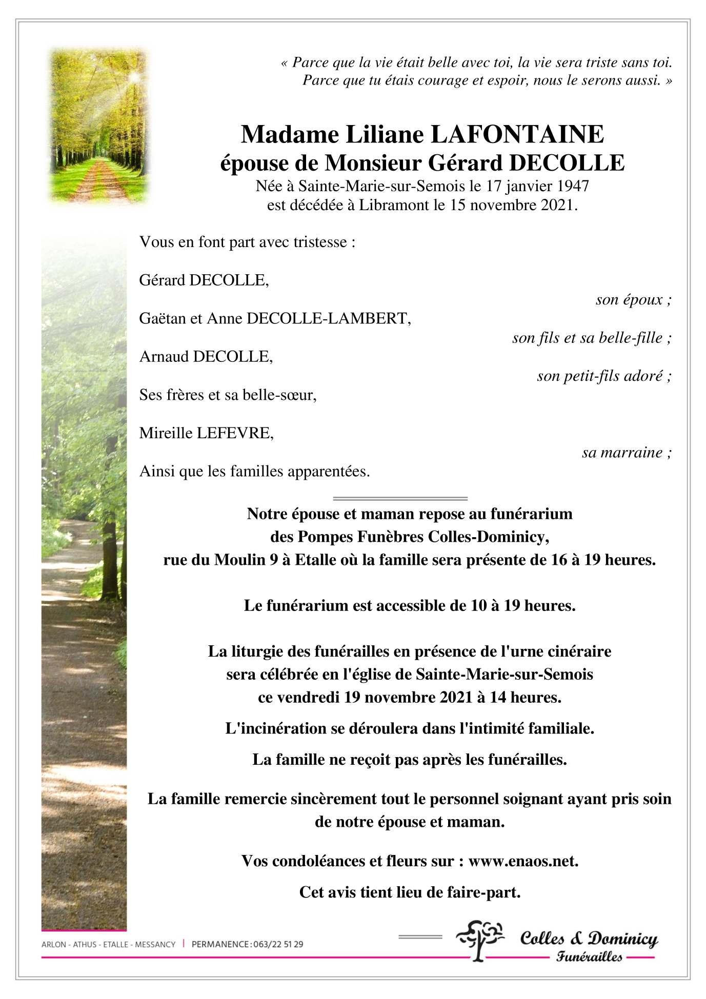Décédée à Libramont-Chevigny (6800) le lundi 15 novembre 2021 à l'âge de 74 ans
