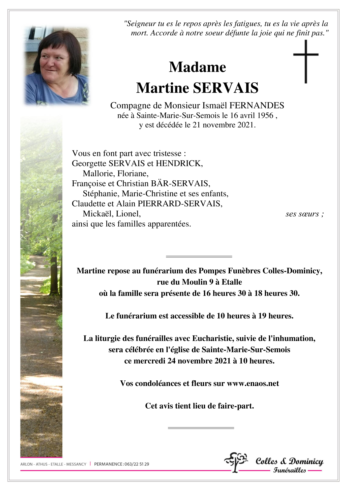 Décédée à Sainte-Marie-sur-Semois (6740) le dimanche 21 novembre 2021 à l'âge de 65 ans