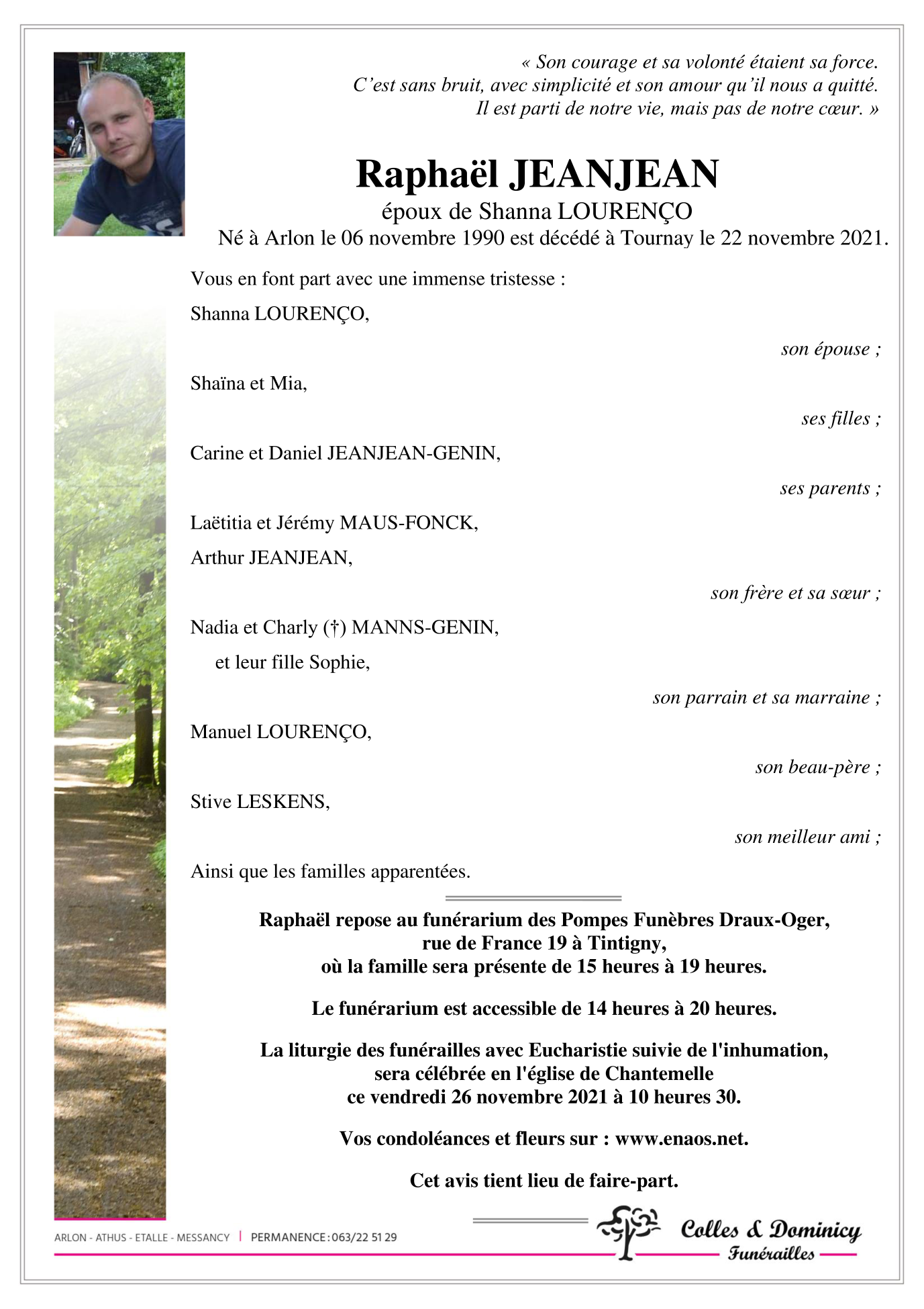 Décédé à Tournay (6840) le lundi 22 novembre 2021 à l'âge de 31 ans