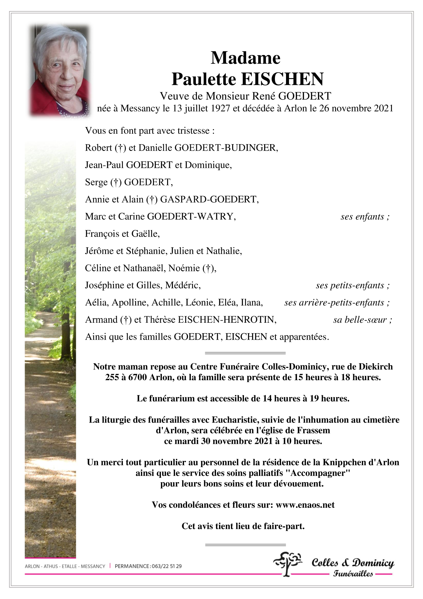 Décédée à Arlon (6700) le vendredi 26 novembre 2021 à l'âge de 94 ans