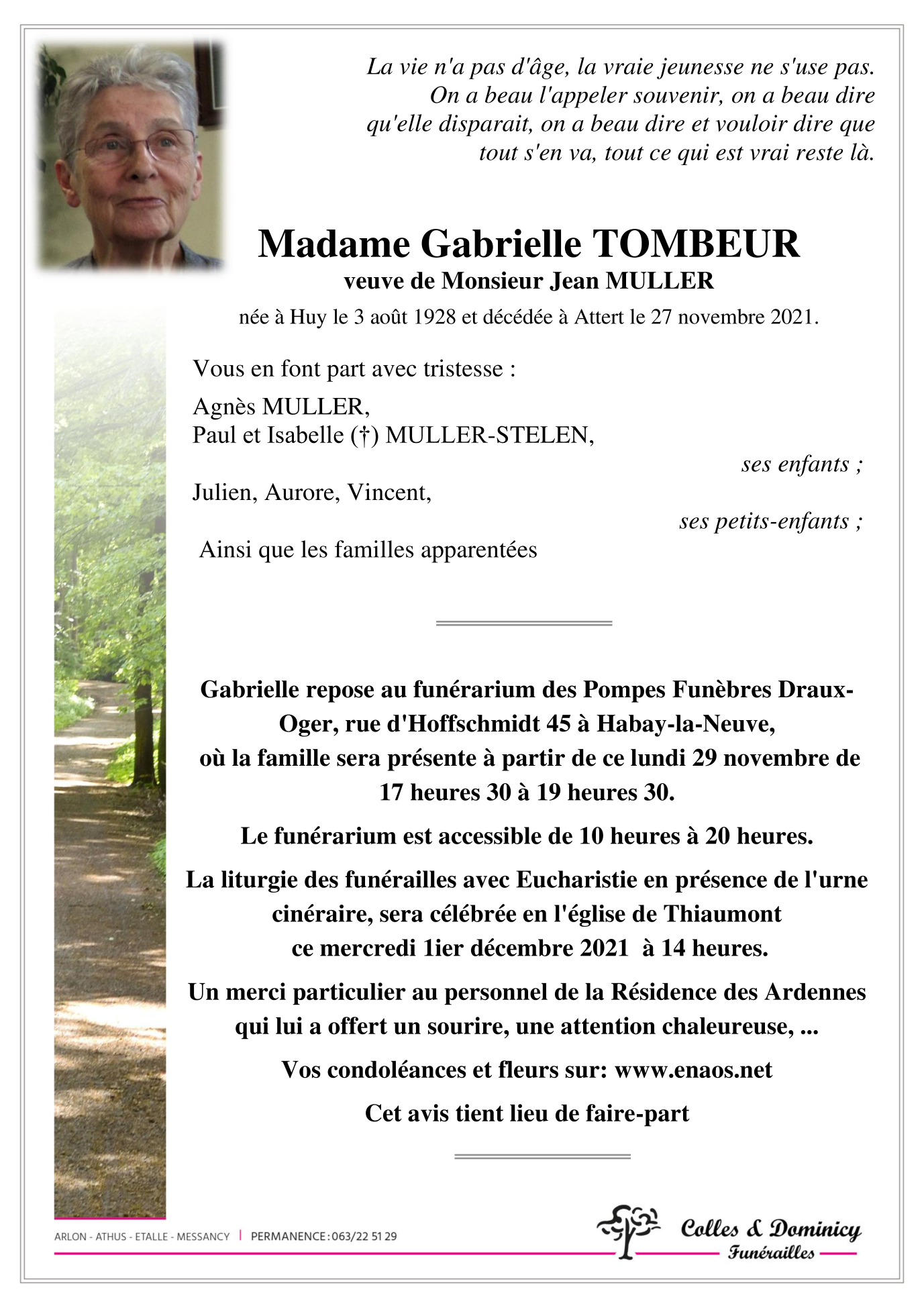 Décédée à Attert (6717) le samedi 27 novembre 2021 à l'âge de 93 ans
