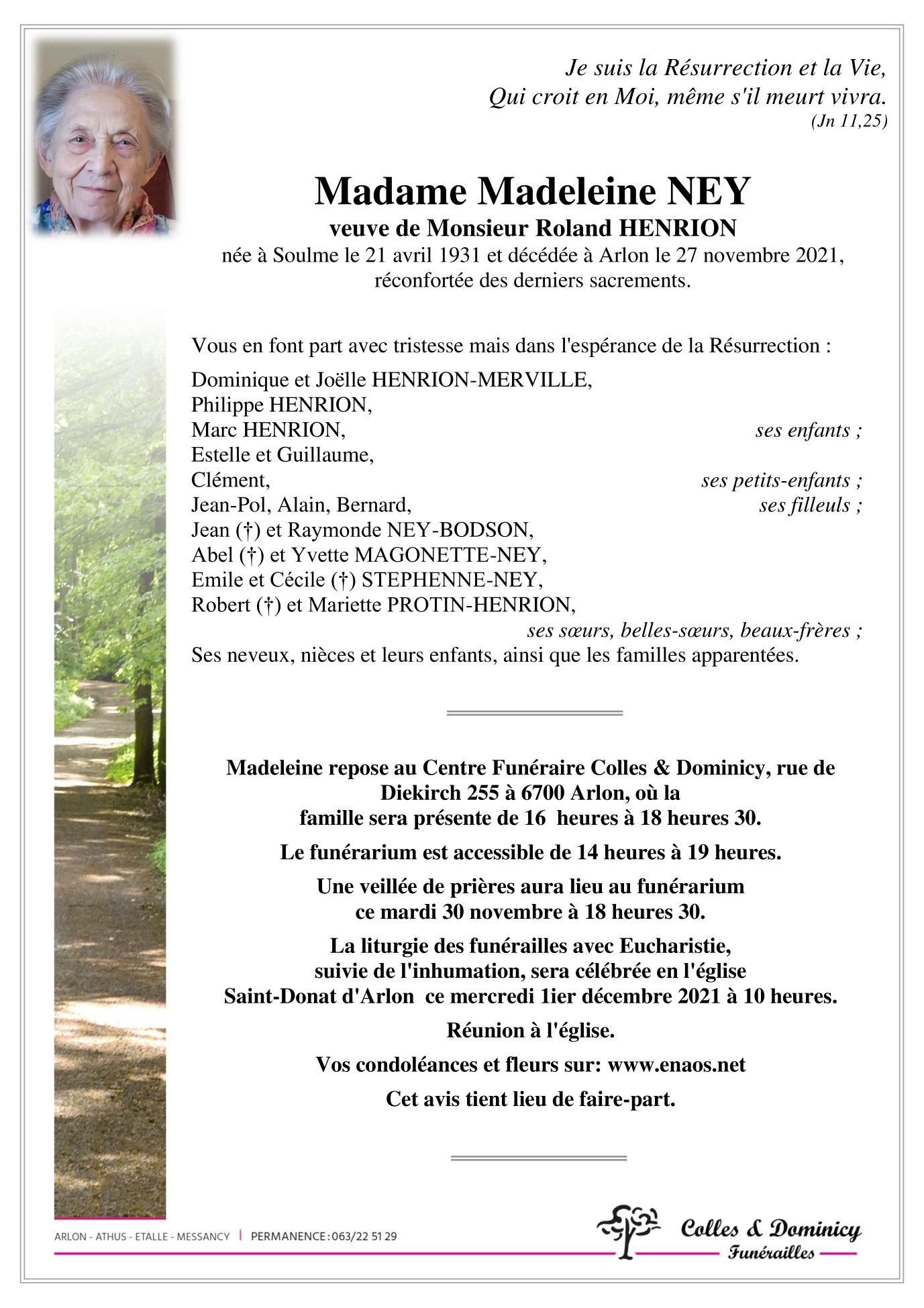 Décédée à Arlon (6700) le samedi 27 novembre 2021 à l'âge de 90 ans