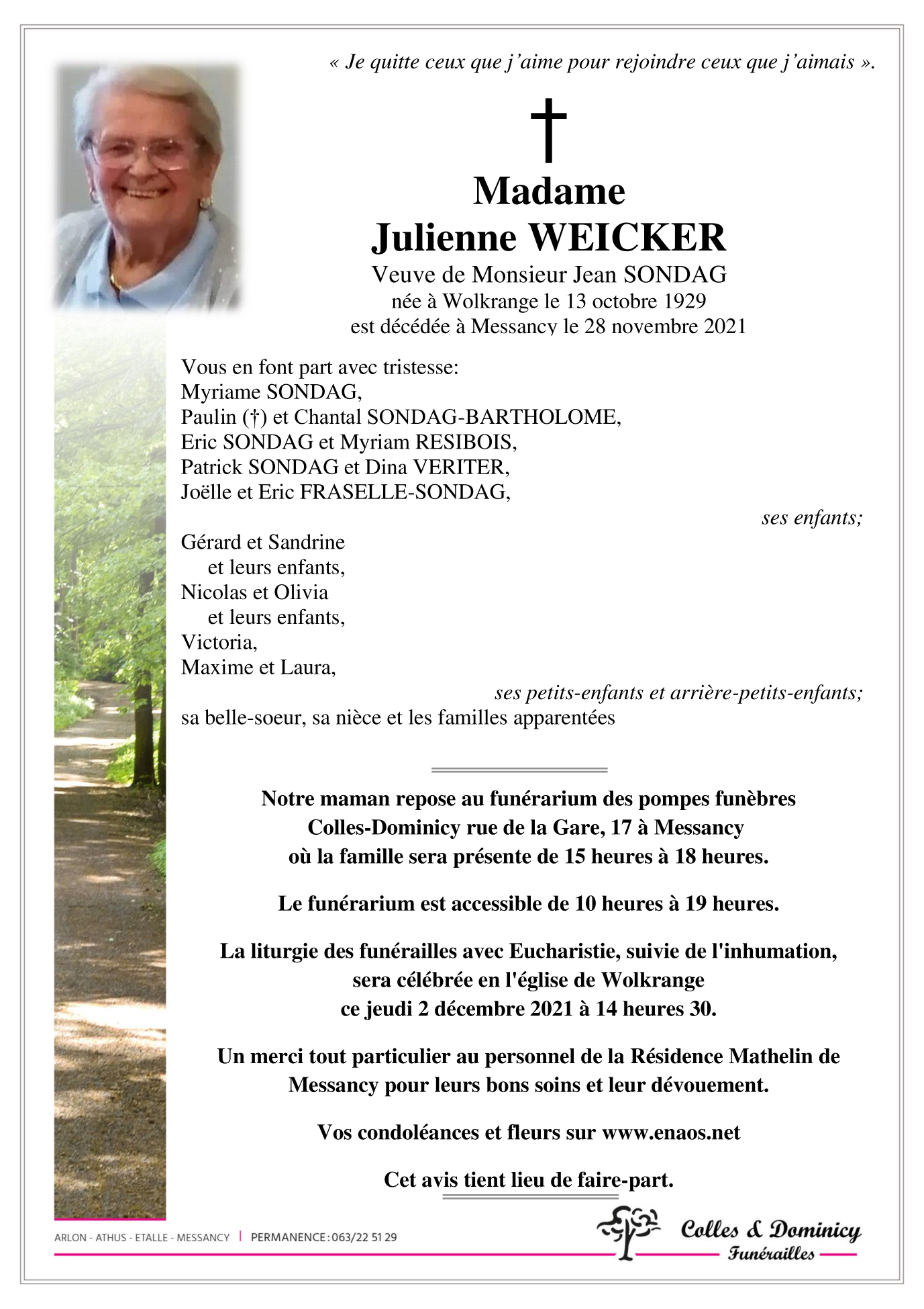 Décédée à Messancy (6780) le dimanche 28 novembre 2021 à l'âge de 92 ans