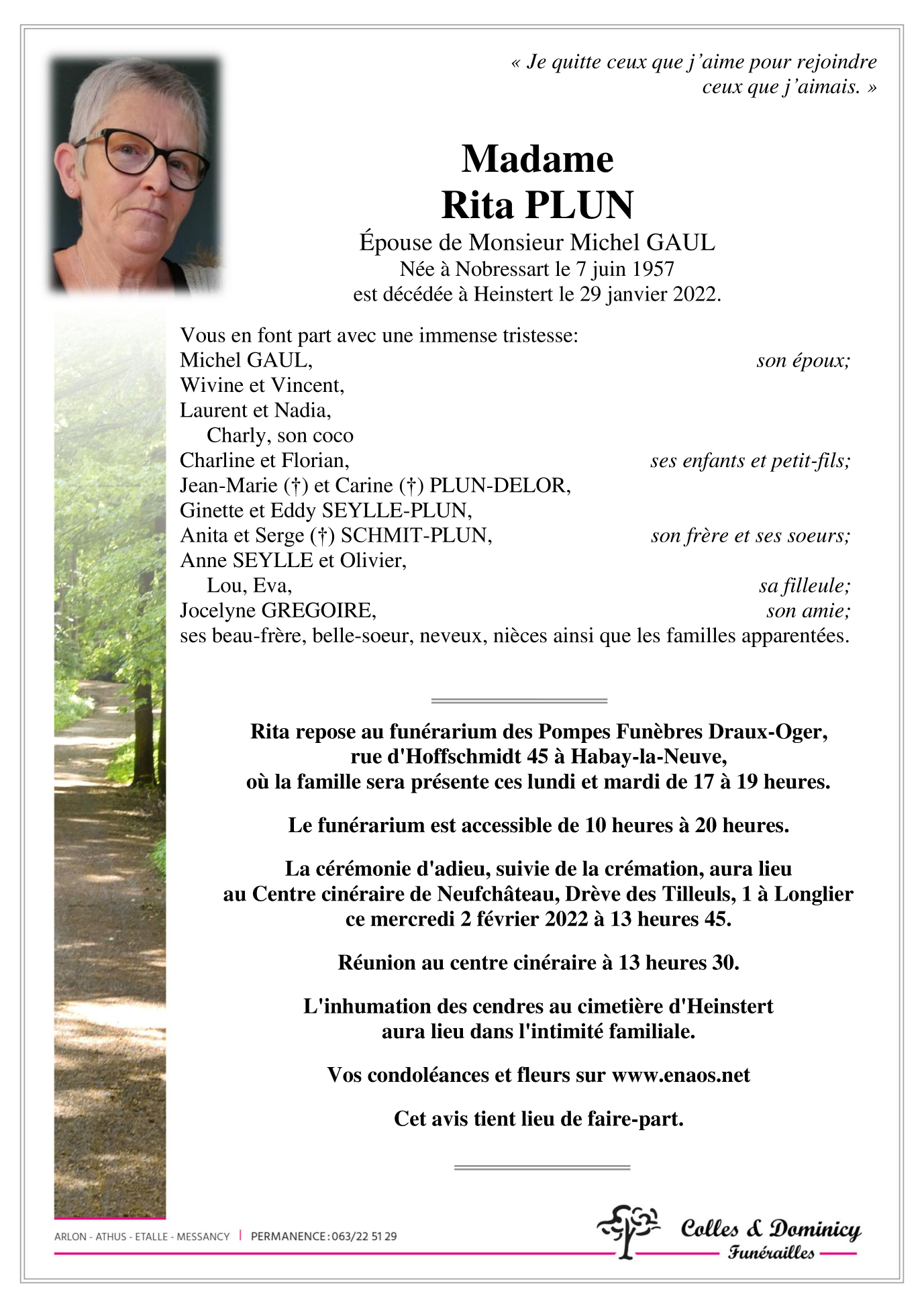 Décédée à Heinstert (6717) le samedi 29 janvier 2022 à l'âge de 64 ans