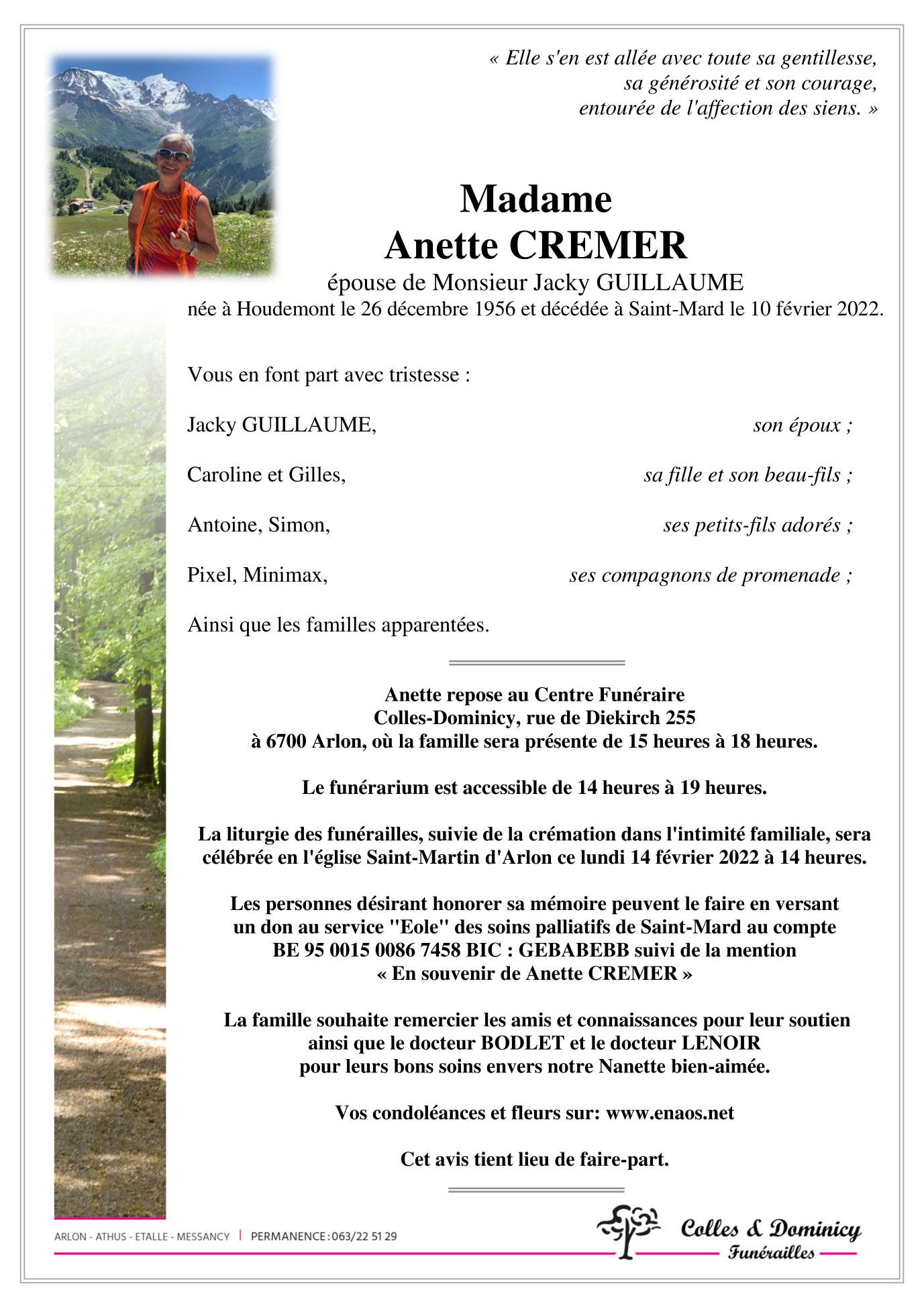 Décédée à Saint-Mard (6762) le jeudi 10 février 2022 à l'âge de 65 ans