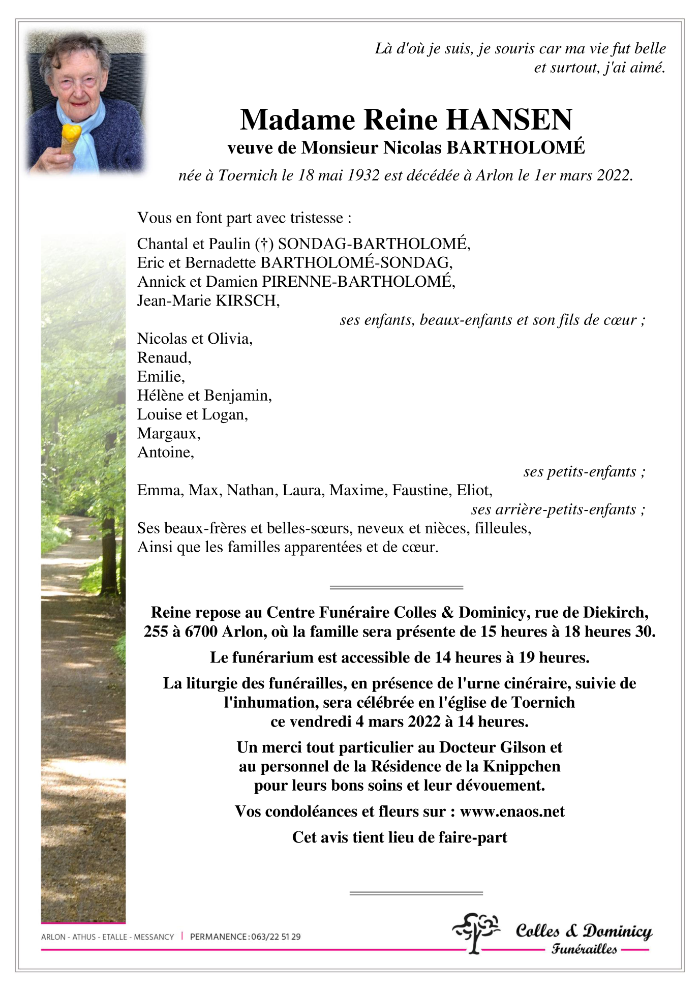 Décédée à Arlon (6700) le mardi 1 mars 2022 à l'âge de 89 ans