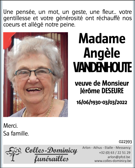 Décédée à Saint-Mard (6762) le jeudi 3 mars 2022 à l'âge de 91 ans
