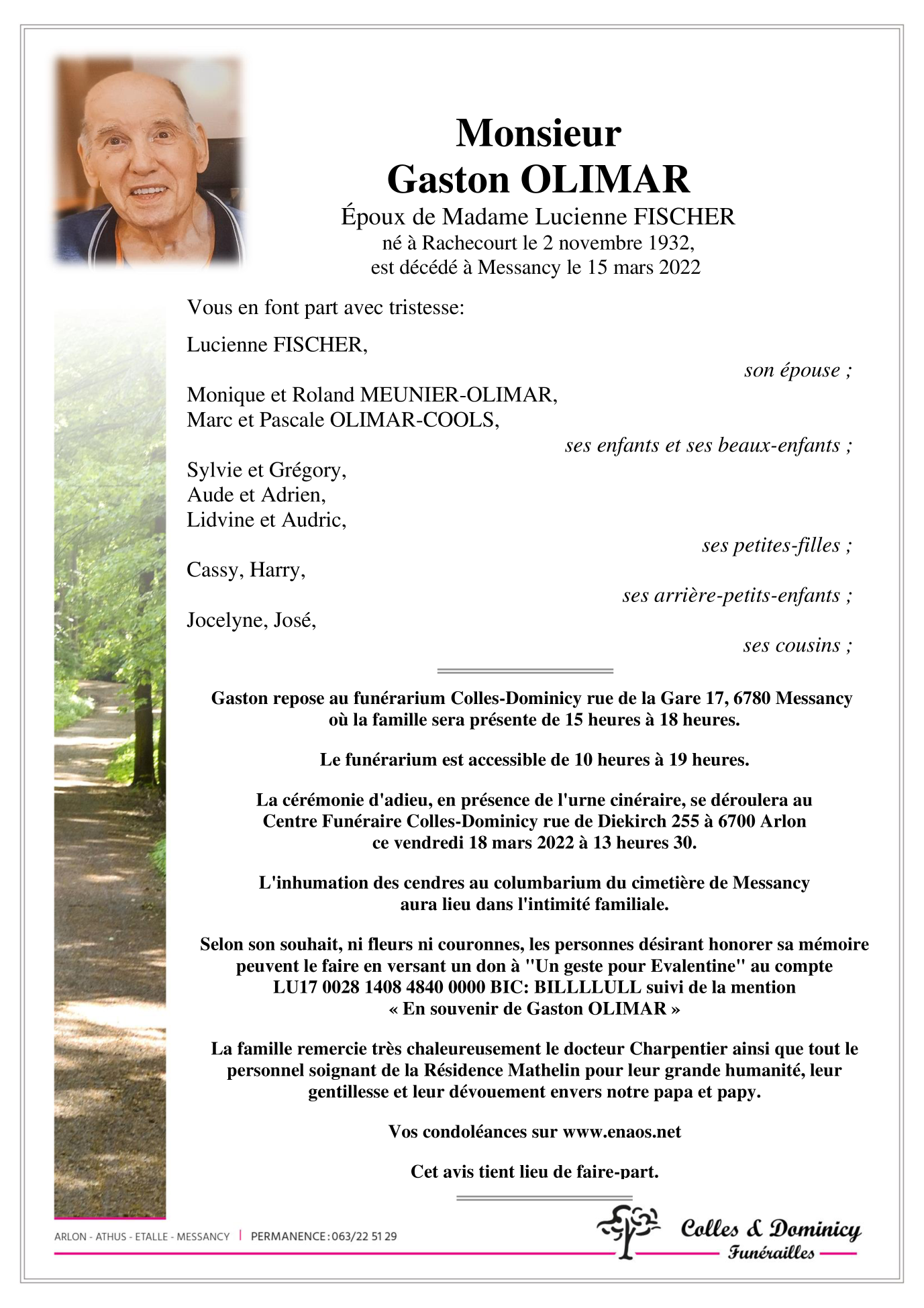 Décédé à Messancy (6780) le mardi 15 mars 2022 à l'âge de 89 ans