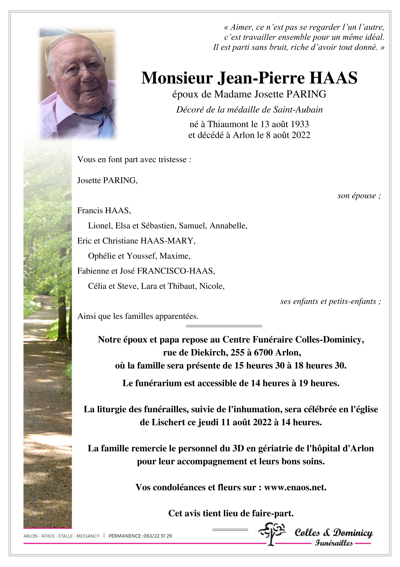 Décédé à Arlon (6700) le lundi 8 août 2022 à l'âge de 88 ans
