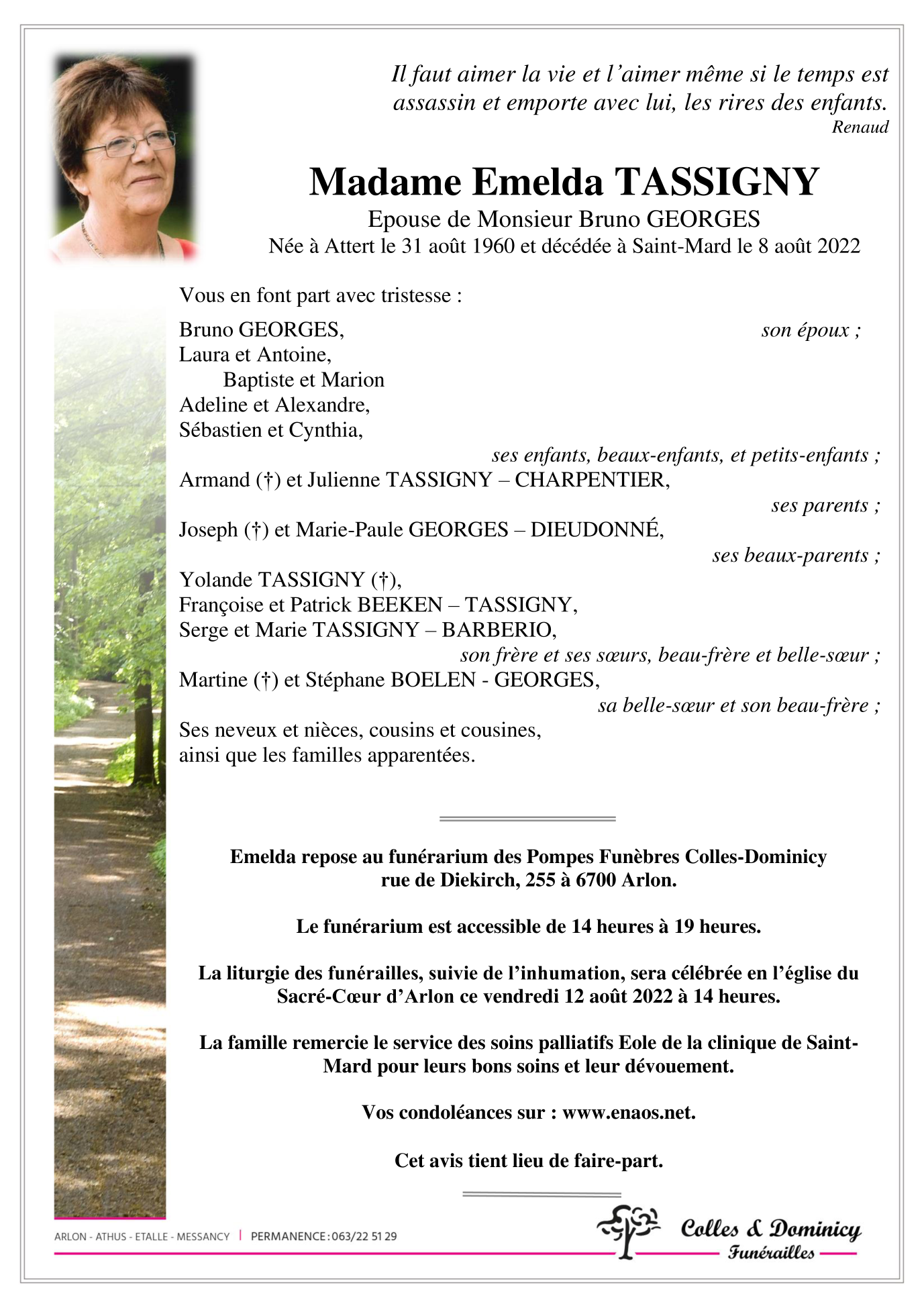 Décédée à Saint-Mard (6762) le lundi 8 août 2022 à l'âge de 61 ans
