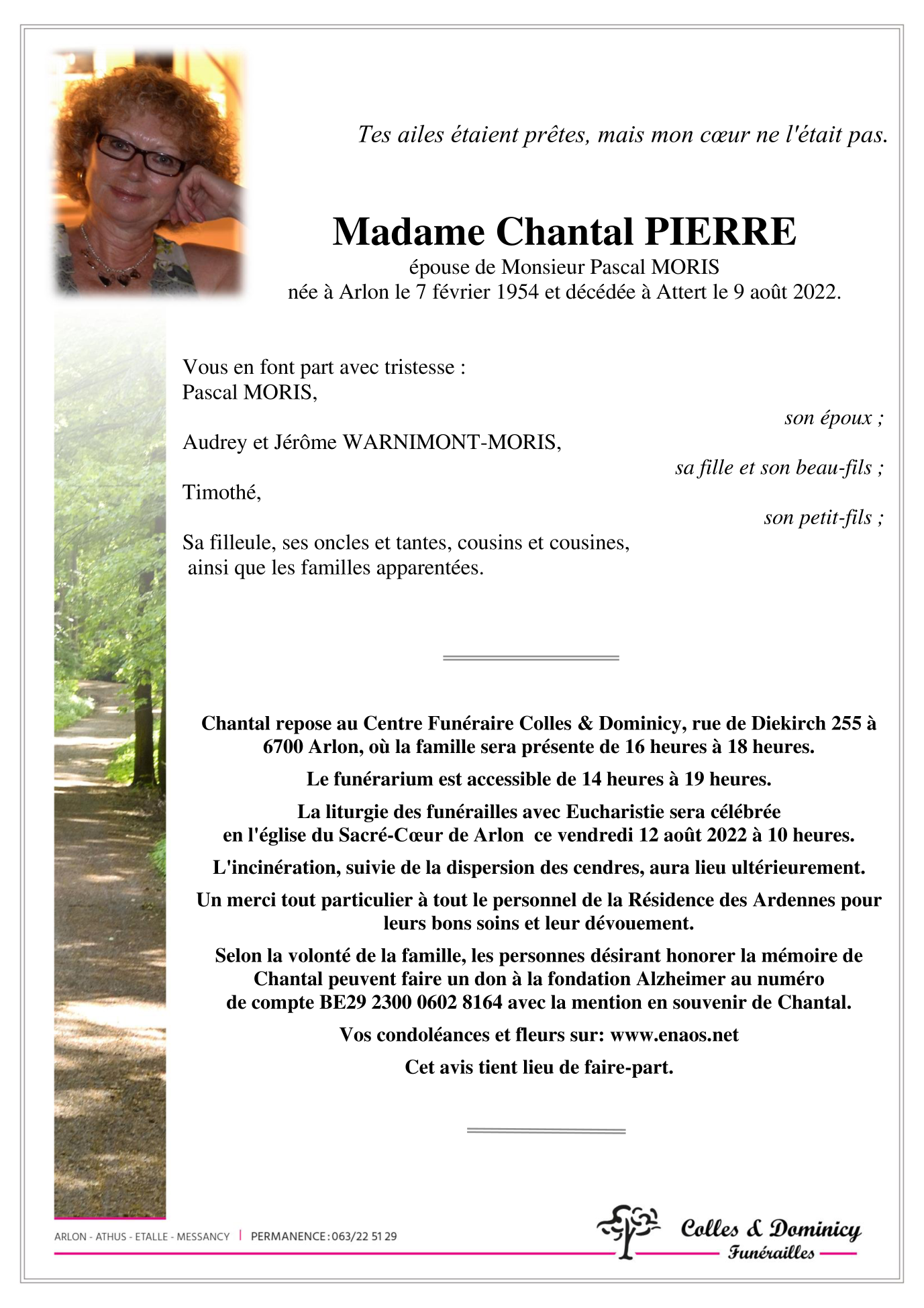 Décédée à Attert (6717) le mardi 9 août 2022 à l'âge de 68 ans