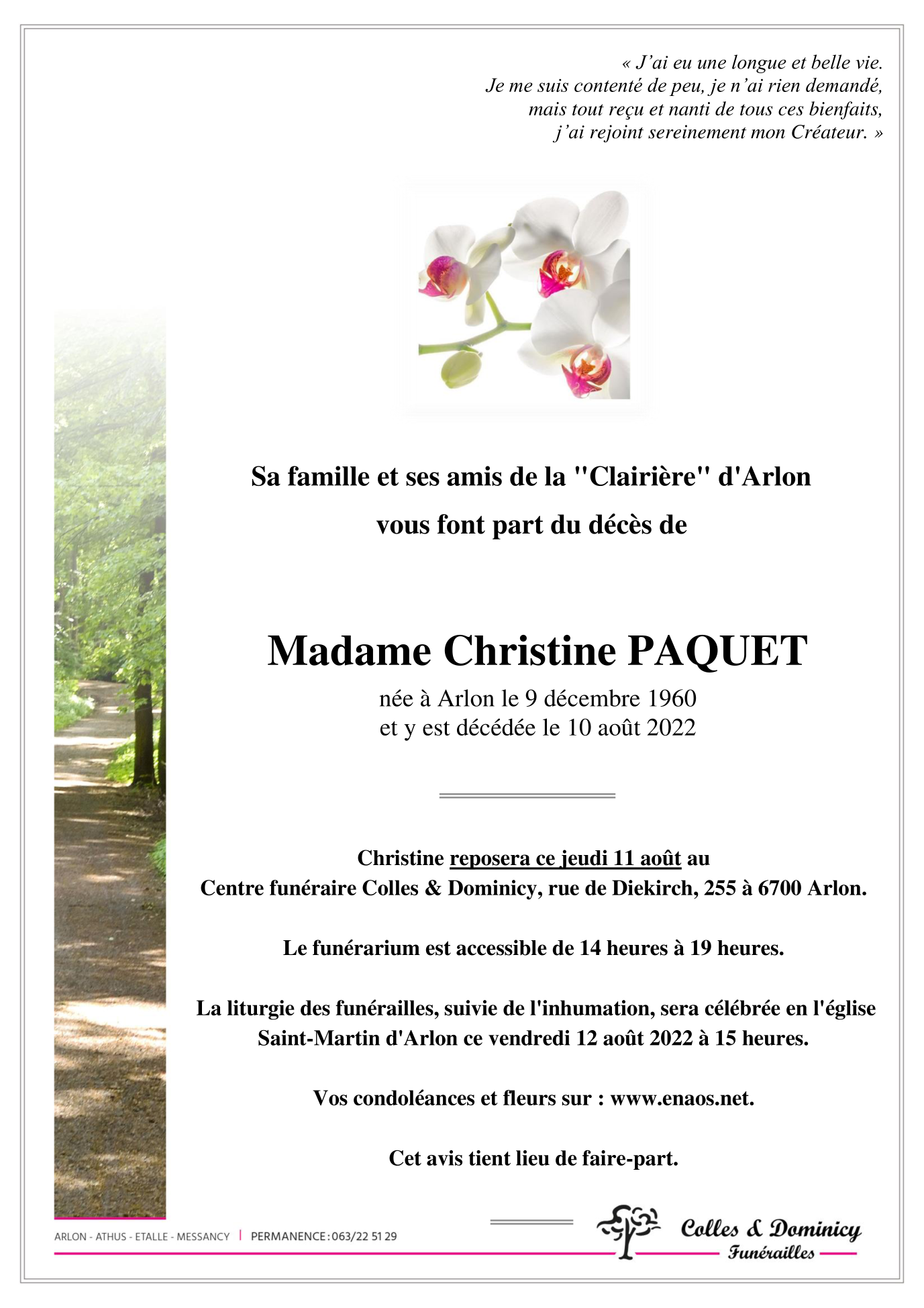 Décédée à Arlon (6700) le mercredi 10 août 2022 à l'âge de 61 ans