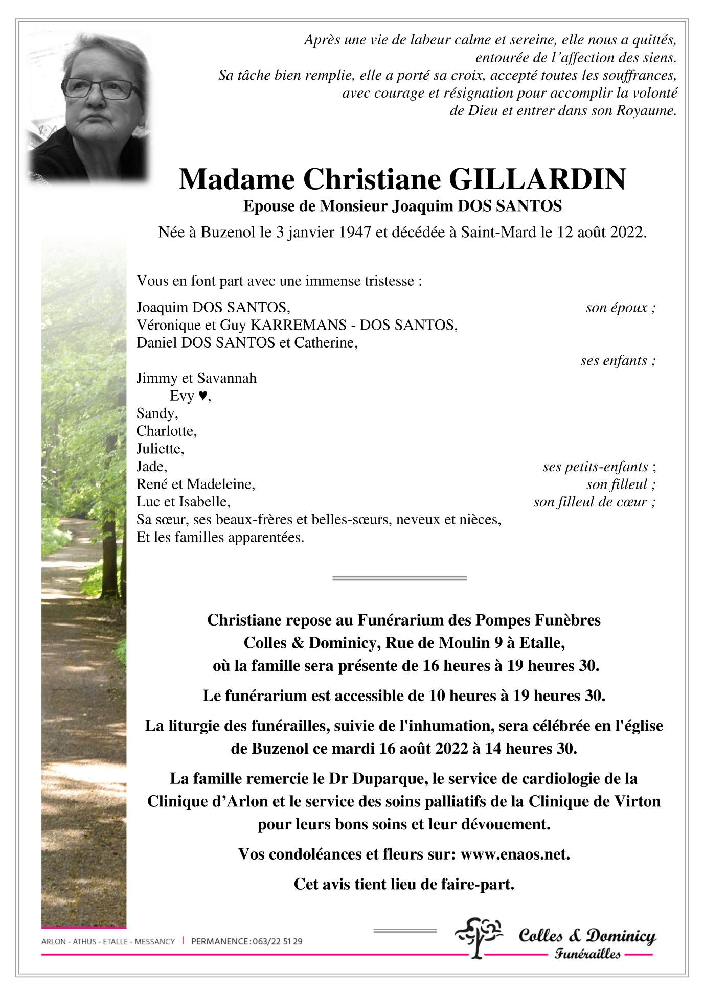 Décédée à Saint-Mard (6762) le vendredi 12 août 2022 à l'âge de 75 ans