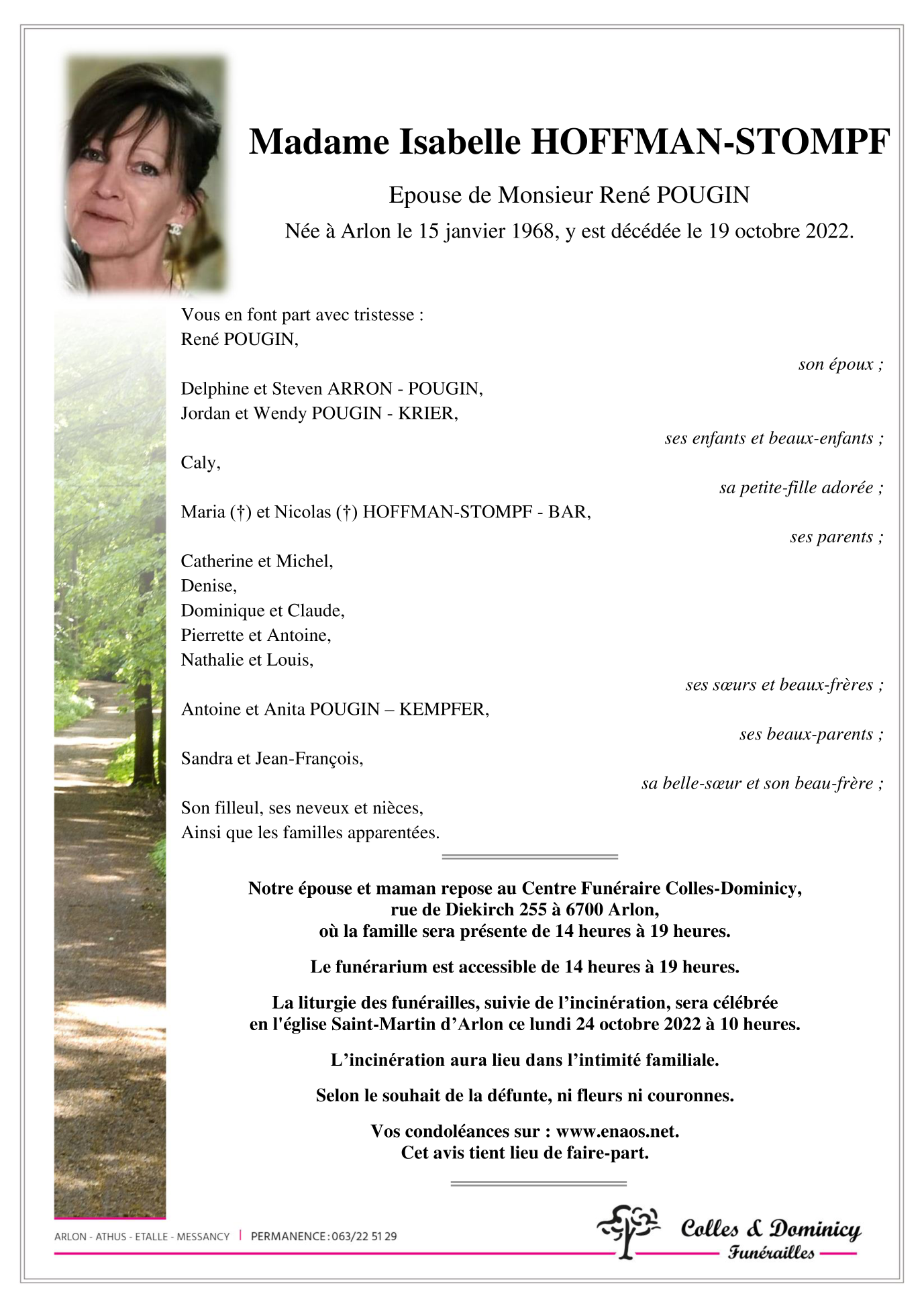 Décédée à Arlon (6700) le mercredi 19 octobre 2022 à l'âge de 54 ans