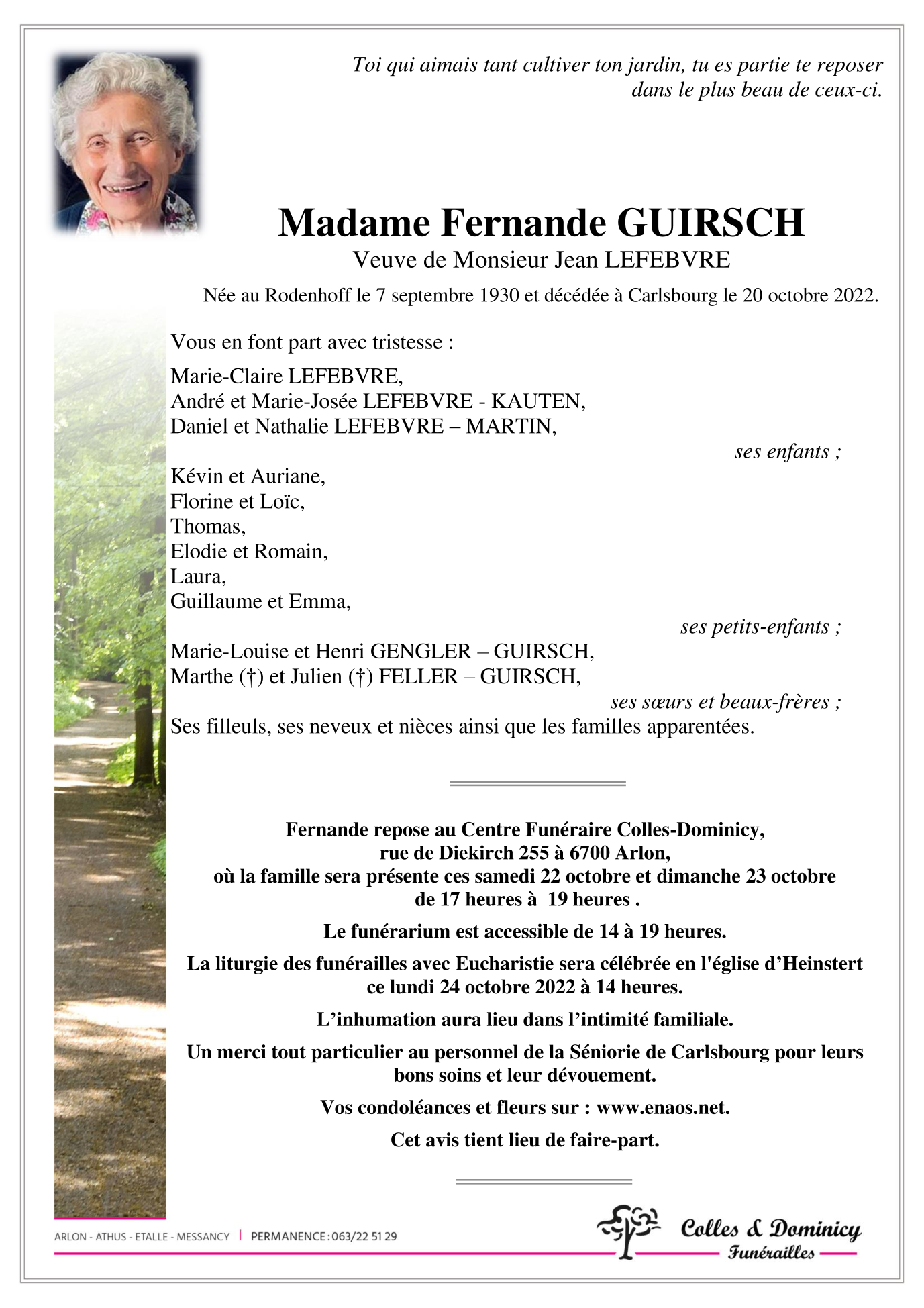 Décédée à Carlsbourg (6850) le jeudi 20 octobre 2022 à l'âge de 92 ans