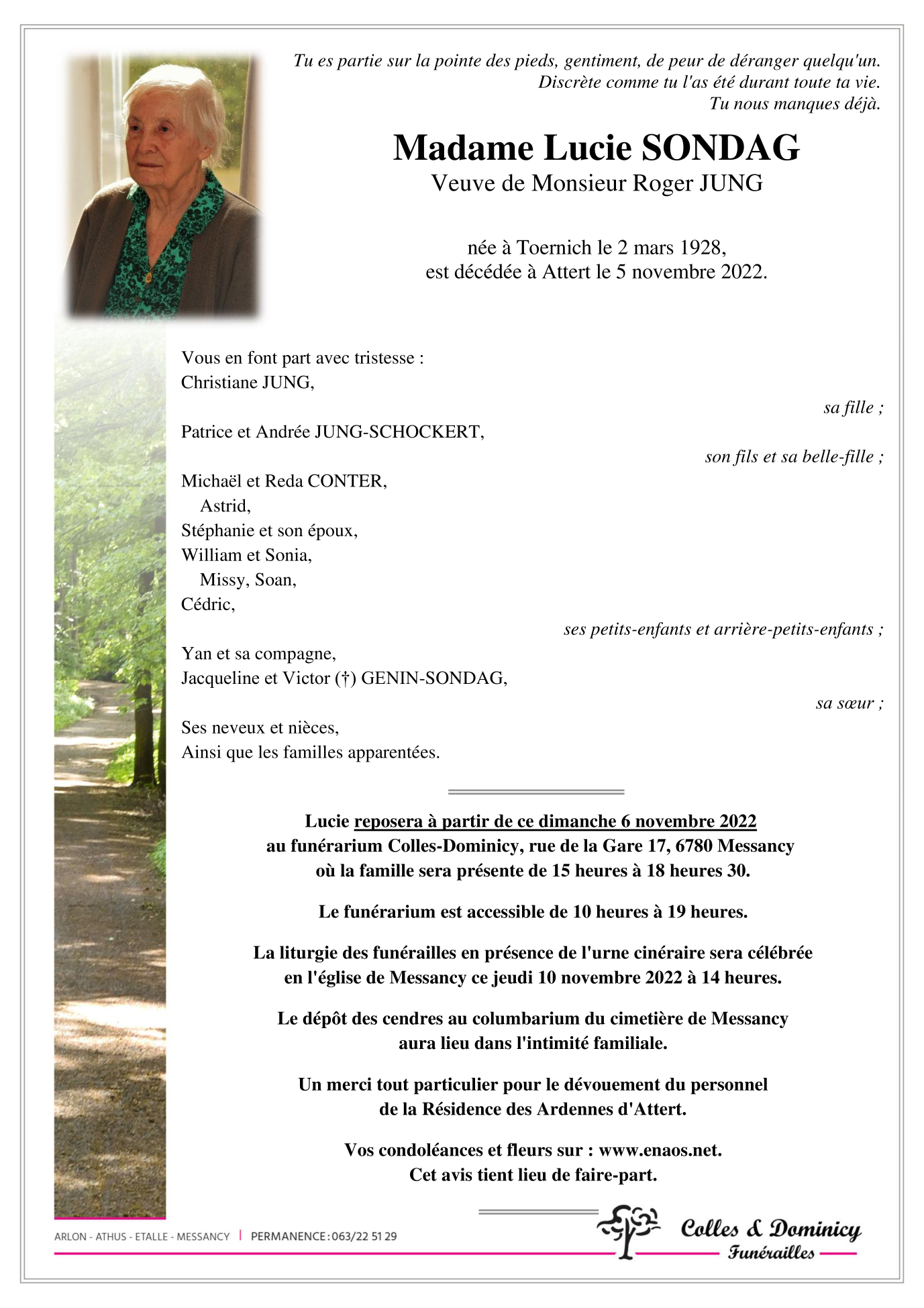 Décédée à Attert (6717) le samedi 5 novembre 2022 à l'âge de 94 ans