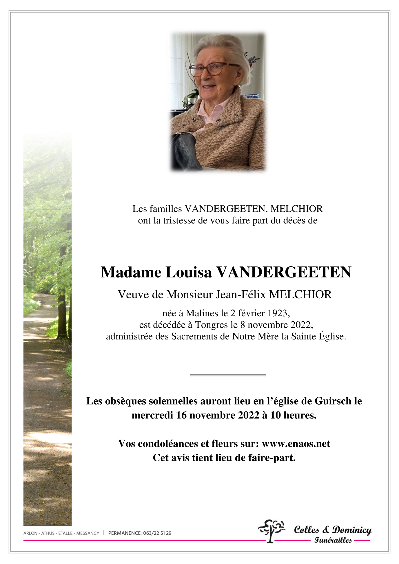 Décédée à Tongeren (3700) le mardi 8 novembre 2022 à l'âge de 99 ans