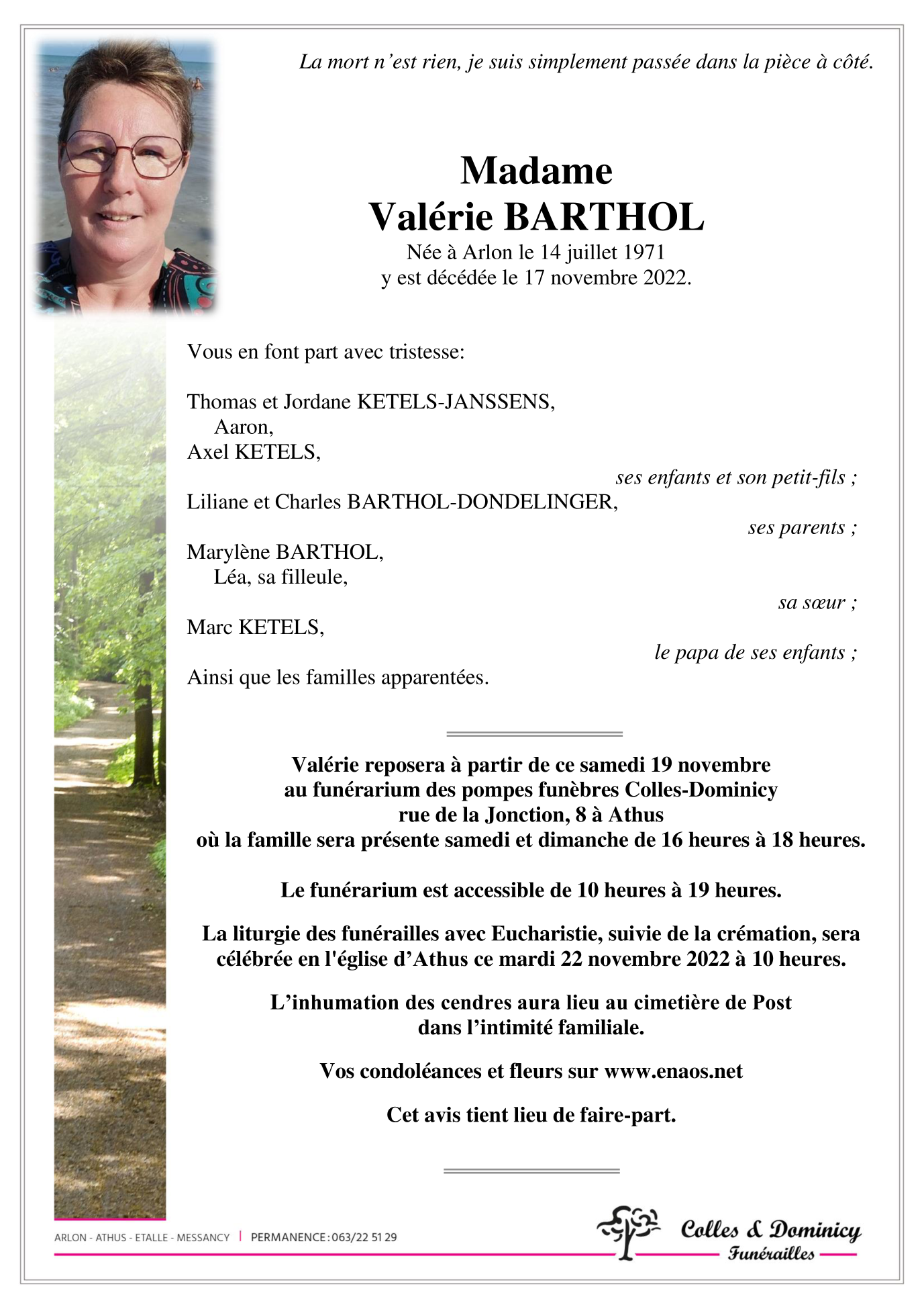 Décédée à Arlon (6700) le jeudi 17 novembre 2022 à l'âge de 51 ans
