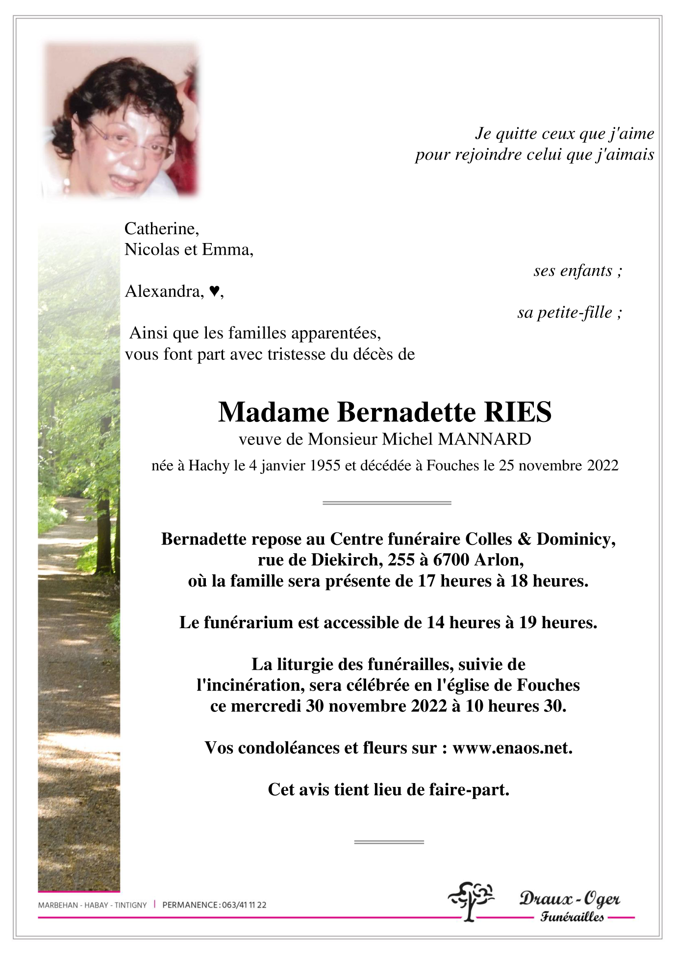Décédée à Fouches (6700) le vendredi 25 novembre 2022 à l'âge de 67 ans