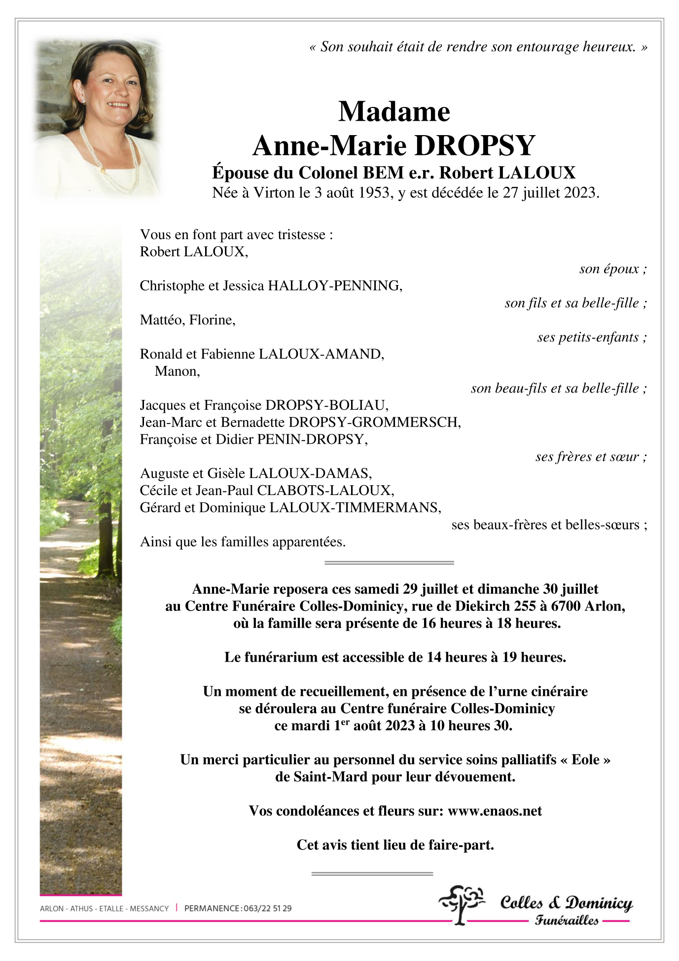 Décédée à Saint-Mard (6762) le jeudi 27 juillet 2023 à l'âge de 69 ans