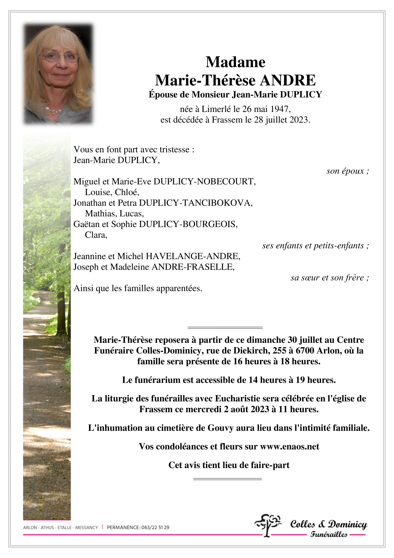 Décédée à Frassem (6700) le vendredi 28 juillet 2023 à l'âge de 76 ans