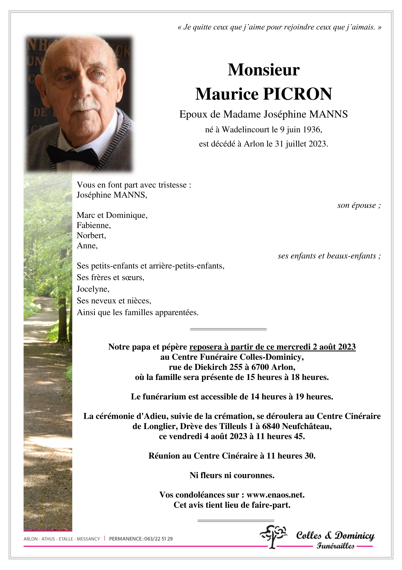 Décédé à Arlon (6700) le lundi 31 juillet 2023 à l'âge de 87 ans