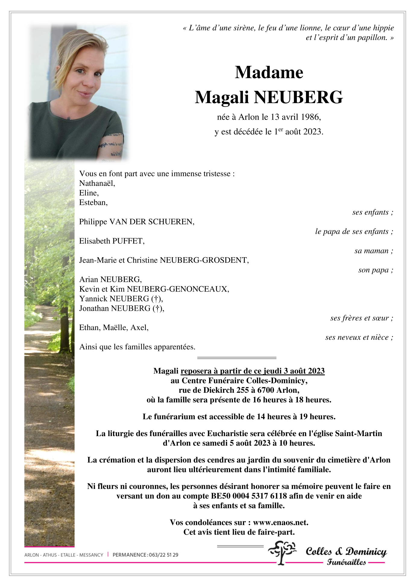 Décédée à Arlon (6700) le mardi 1 août 2023 à l'âge de 37 ans