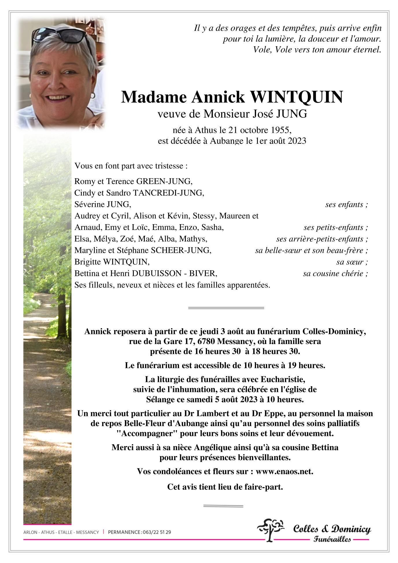 Décédée à Aubange (6790) le mardi 1 août 2023 à l'âge de 67 ans