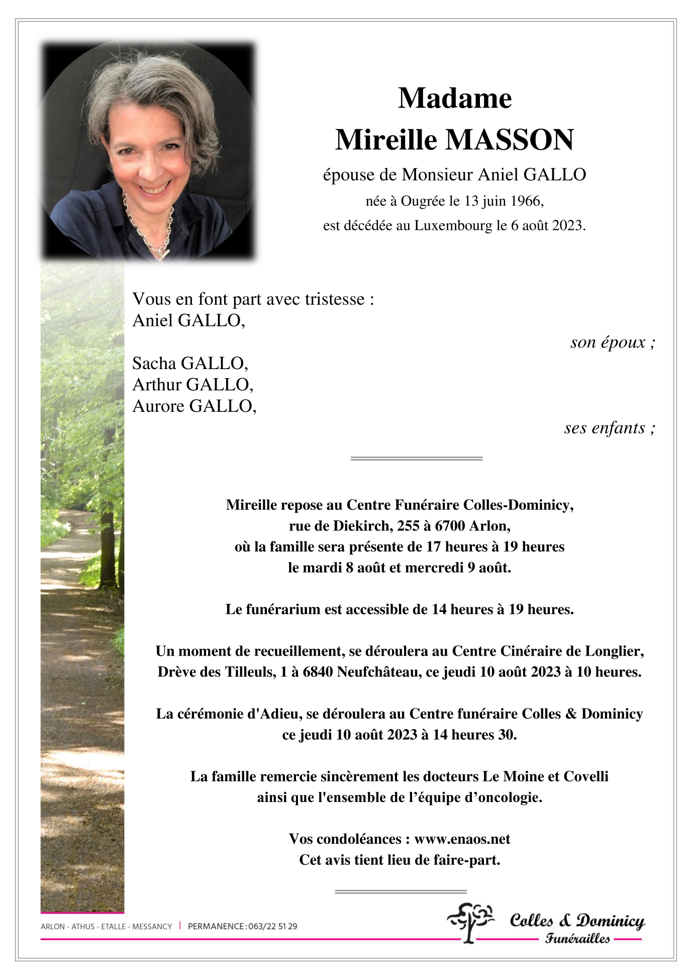 Décédée à Esch-sur-Alzette (Luxembourg) le dimanche 6 août 2023 à l'âge de 57 ans