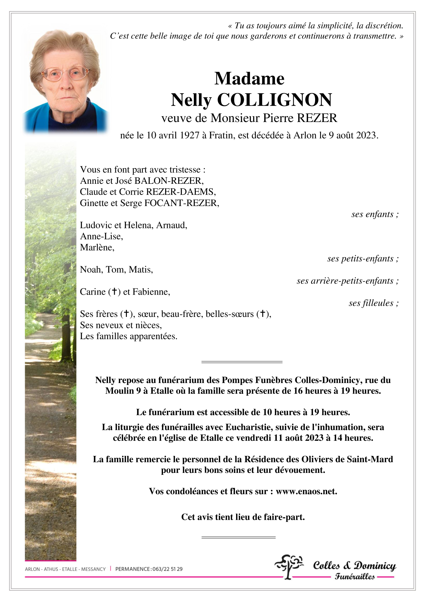 Décédée à Arlon (6700) le mercredi 9 août 2023 à l'âge de 96 ans